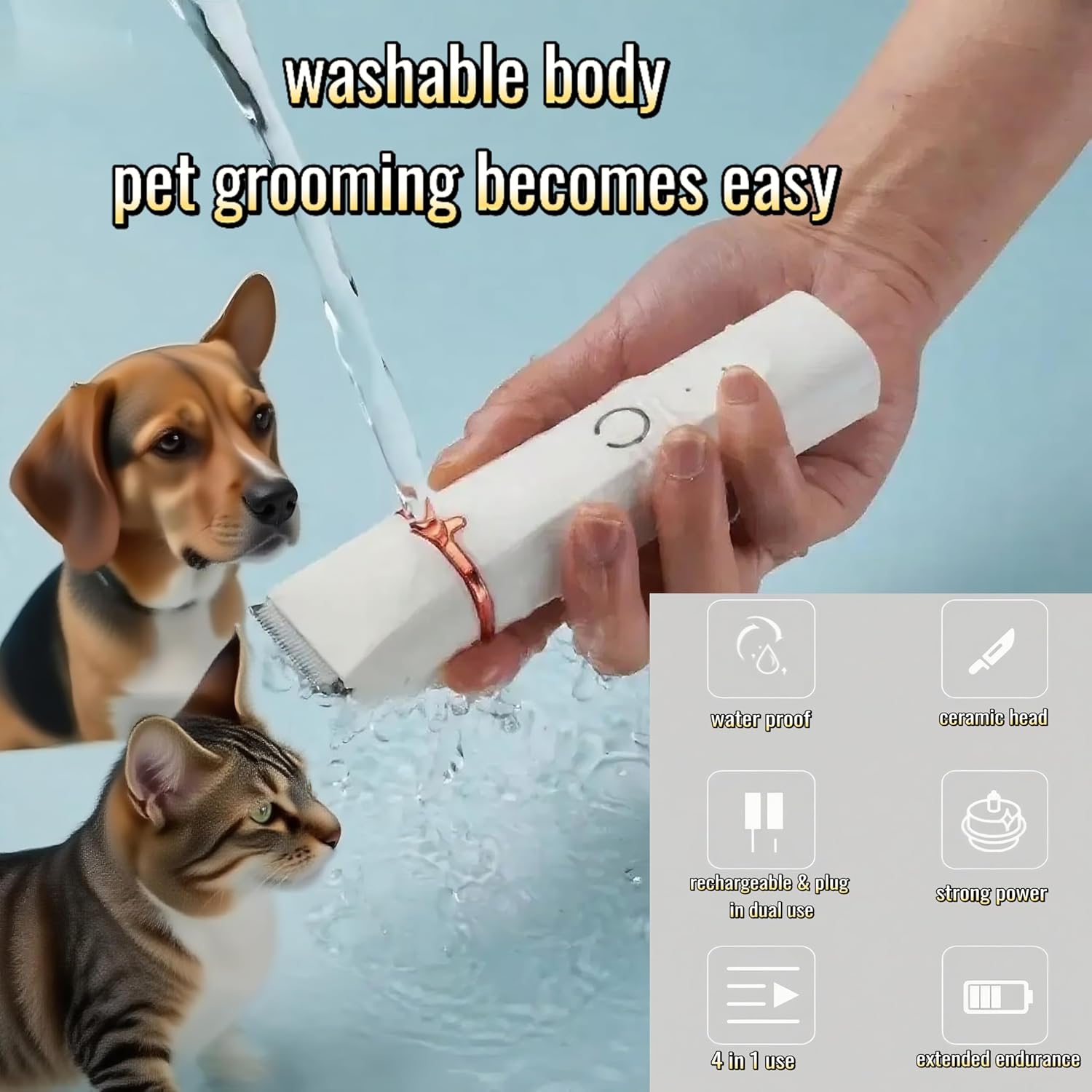 - 【Waterproof Design|Fully Washable, Hassle-Free Cleaning】 This cordless dog clipper entire device features a fully washable structure. After pet dog cat grooming pet's fur, simply rinse both blades and body directly under running water – effectively removing all hair and dust residues for thorough sanitation. This design is ideal for frequent-use scenarios, helping maintain device hygiene while prolonging product life, and effortlessly meeting the daily dog cat rabit grooming demands of multi-pet households.