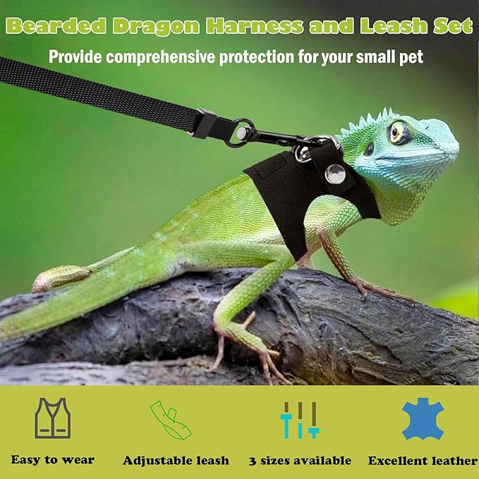 - EASY TO WEAR : Our Bearded Dragon Harness has a snap buckle and adjustable hook-and-loop design for quick, easy on and off. Simply place the harness on your pet's chest, guide the front legs through the two holes, secure the buckle, and connect the iron rings with the metal snap fastener.