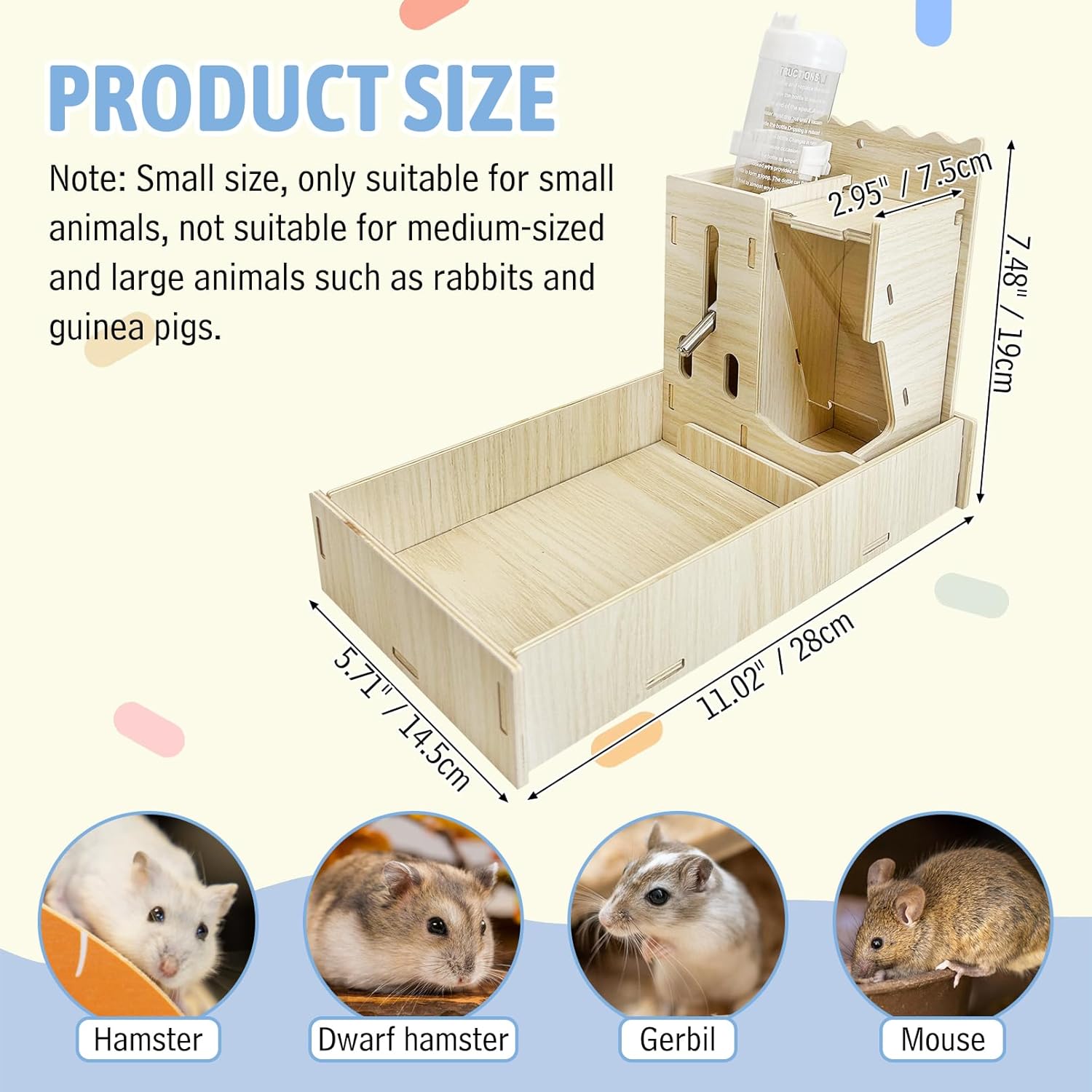 - 3 in 1 Function: This wooden hamster feeder combines a feeder, water bottle and toilet in one. The feeder provides food for your pet and is easy to use, the automatic water bottle ensures a fresh supply of water, and the toilet can be filled with litter to meet your hamster's daily needs and maintain a clean living space
