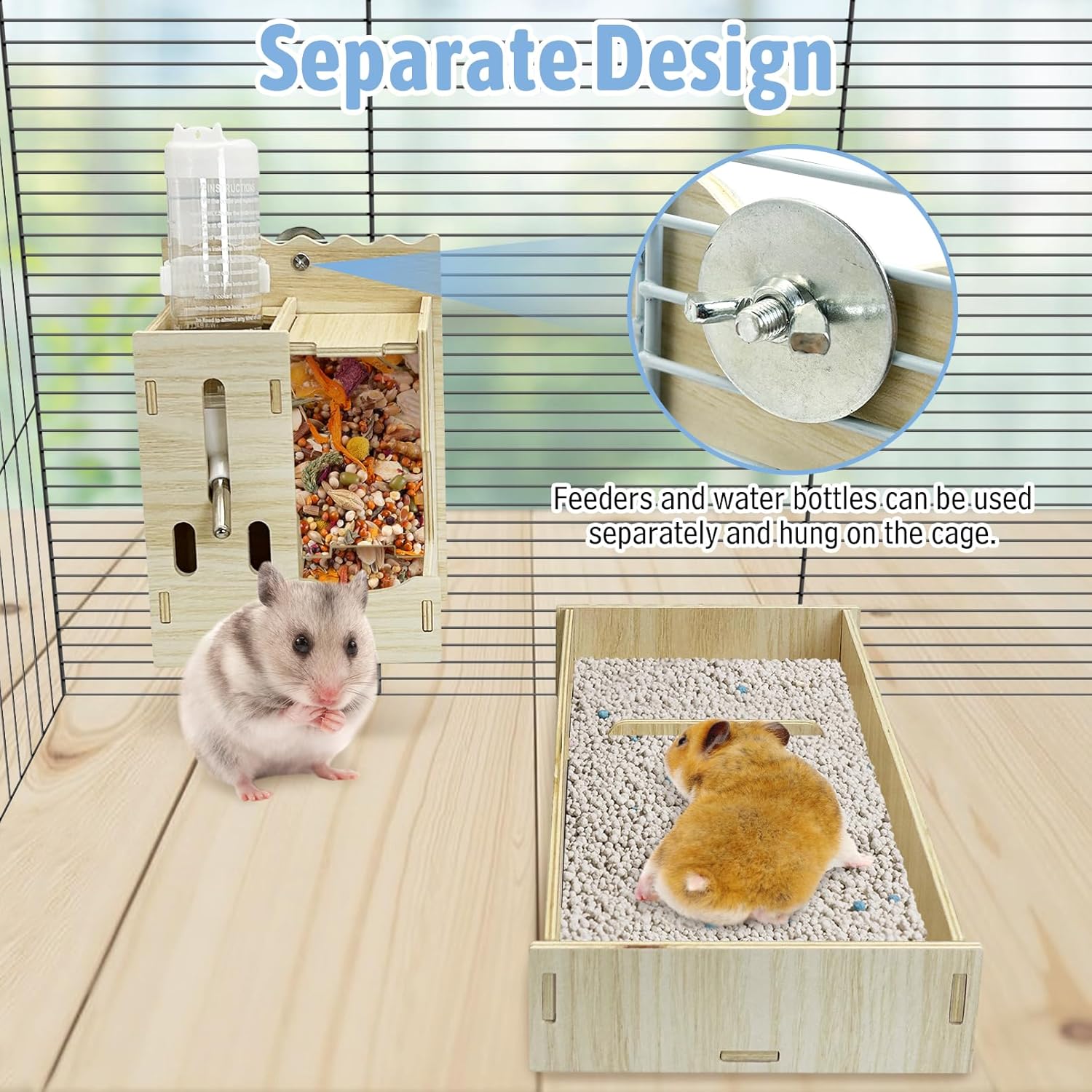 Hamiledyi 3 in 1 Wooden Hamster Feeder Dispenser Hanging Dwarf Hamster Food Bowl & Water Bottle with Removable Litter Box Small Animal Feeder for Hamsters Mouse Gerbil (11" x 5.7" x 7.5")
