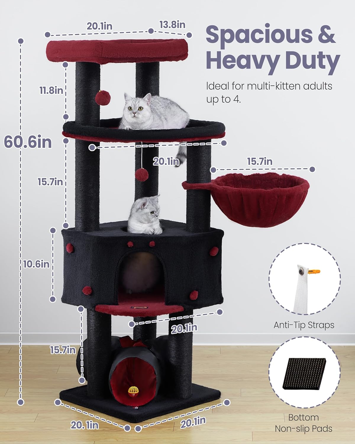 Cat Tree Tower for Indoor Cats Large Adult - Heavy Duty Extra Wide Scratching Post (φ4.4in) Maine Coon Condo House with Hammock Tunnel - 60 Inch XL Feline Bed Trees - Big Multi Level Cat Houses Stand