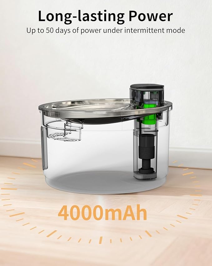 - 【Wireless Design】: Our cordless cat water feeder is designed for more scenes, no more worrying about not having a suitable socket to connect with your fountain. You can put it everywhere at home, such as, bedroom, the cat villa, the corridors, etc.