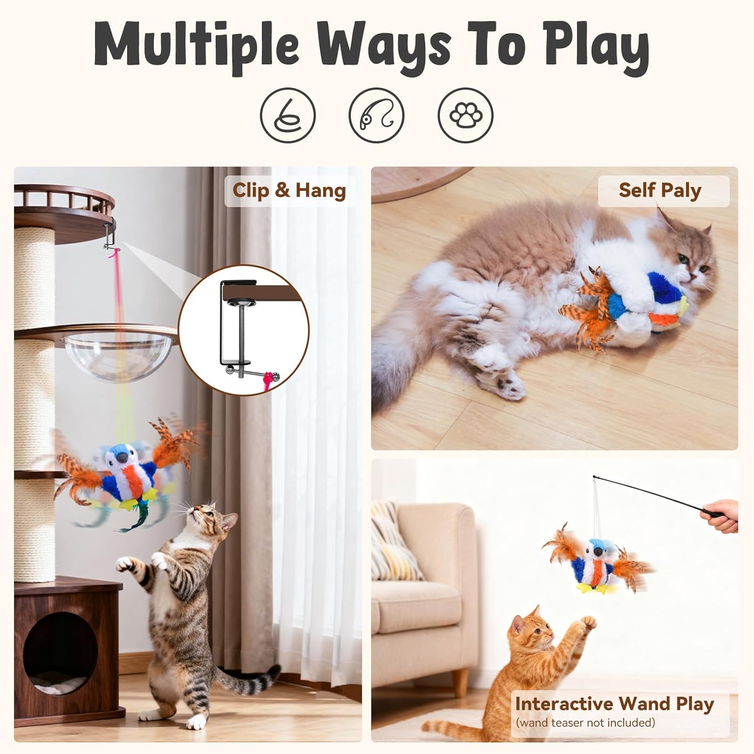 - Hanging Cat Toy: This automatic flying bird cat toy is designed for your fur baby. This cat toy is perfect for any indoor setting. It can be hung with a clip on door frames, tables, cat climbing frames, and anywhere else. Its realistic shape, movements, and sounds will trigger your cat's hunting instincts and encourage playful play. The flying bird cat toy is suitable for cats of all ages and is the perfect gift for any cat.