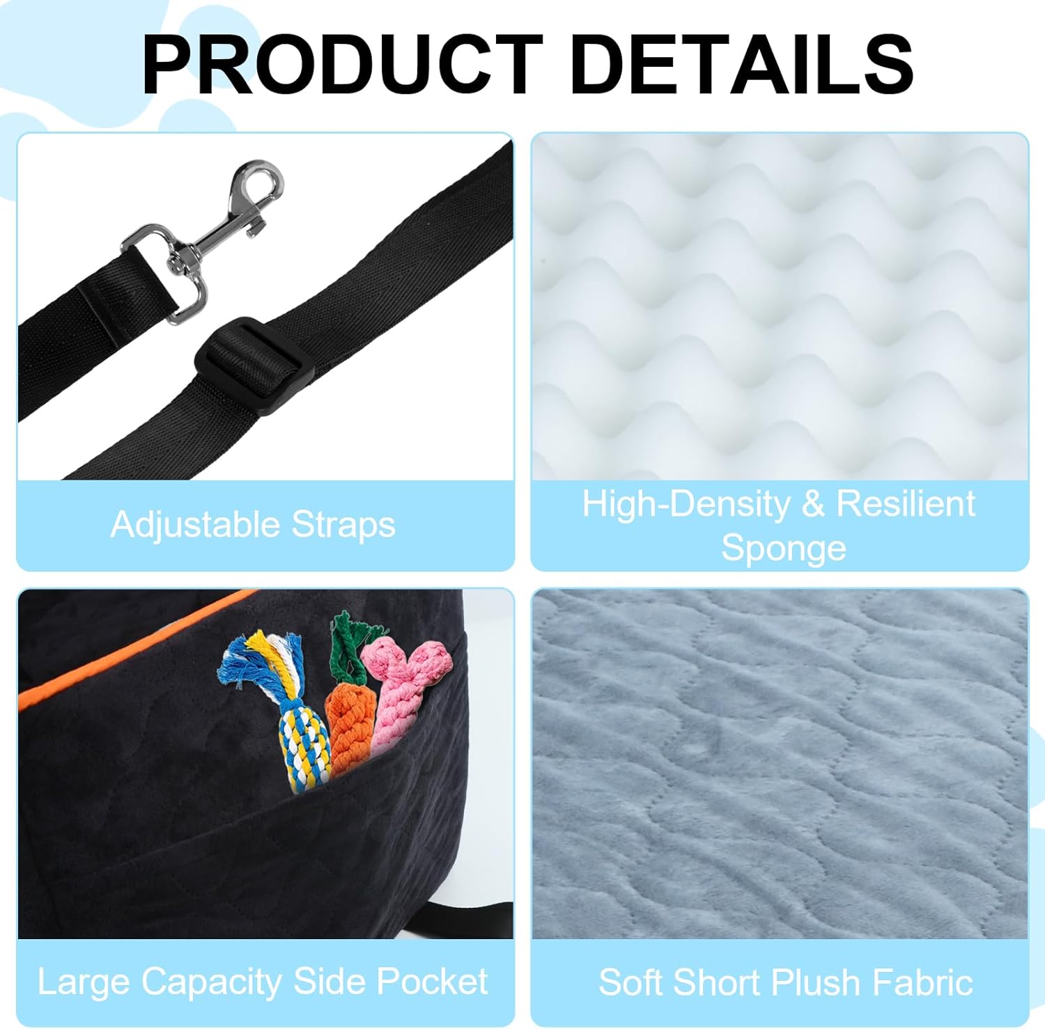 - 【Comfort with Dual-Sided Design】 This pet car seat features a double-sided design, with one side made of soft short plush fabric, and the other side made of breathable Oxford fabric, ensuring your pet stays warm in winter and cool in summer for year-round comfort. The bottom is filled with high-density foam to provide superior support, effectively reducing the impact of road bumps and vibrations.