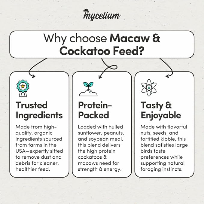 Mycelium Organic Macaw & Cockatoo Feed (5 LB Bag) | Organic Bird Seed for Large Pet Birds| High-Protein Seed, Pellet & Kibble Mix with Vitamins | Supports Digestion & Energy | USA-Made & Non-GMO