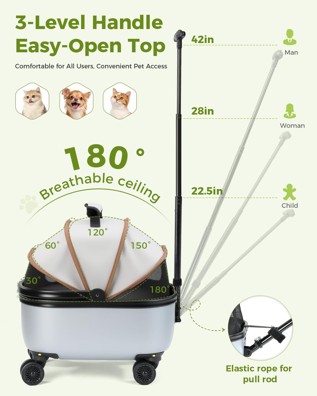 - Special Feature : Comfort: Breathable mesh + removable soft cushion for outdoor relaxation., Design: 180° wide-open entry + top access hatch for maximum convenience in outdoor scenarios., Durability: Hard luggage-grade exterior + reinforced hard bottom board + silent all-terrain wheels., Functionality: 3-in-1 (rolling/carrying/stationary pet nest) for versatile outdoor use., Mobility: Silent wheels with smooth-rolling bearings + telescopic handle for effortless transport. Comfort: Breathable mesh + removable soft cushion for outdoor relaxation., Design: 180° wide-open entry + top access hatch for maximu… See more