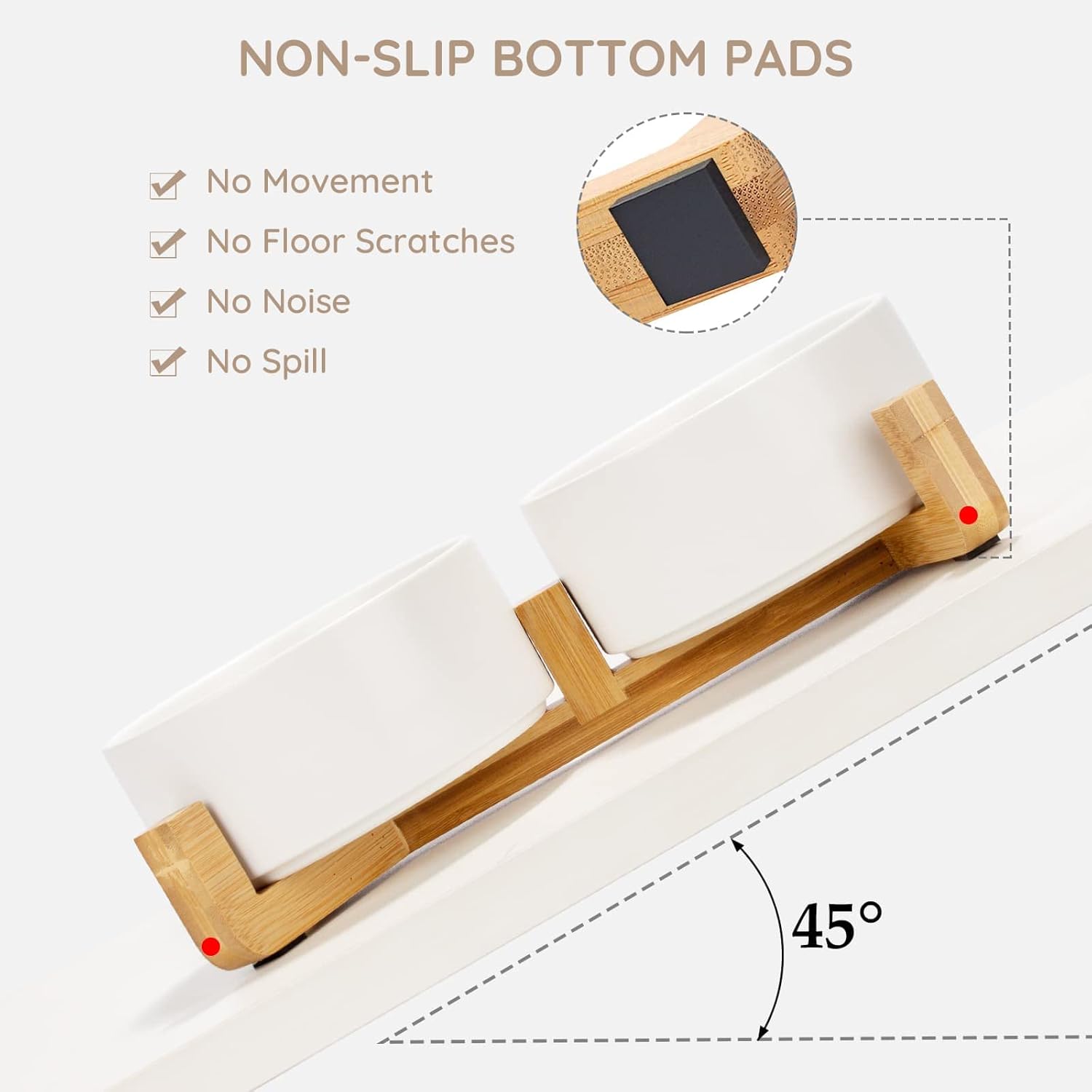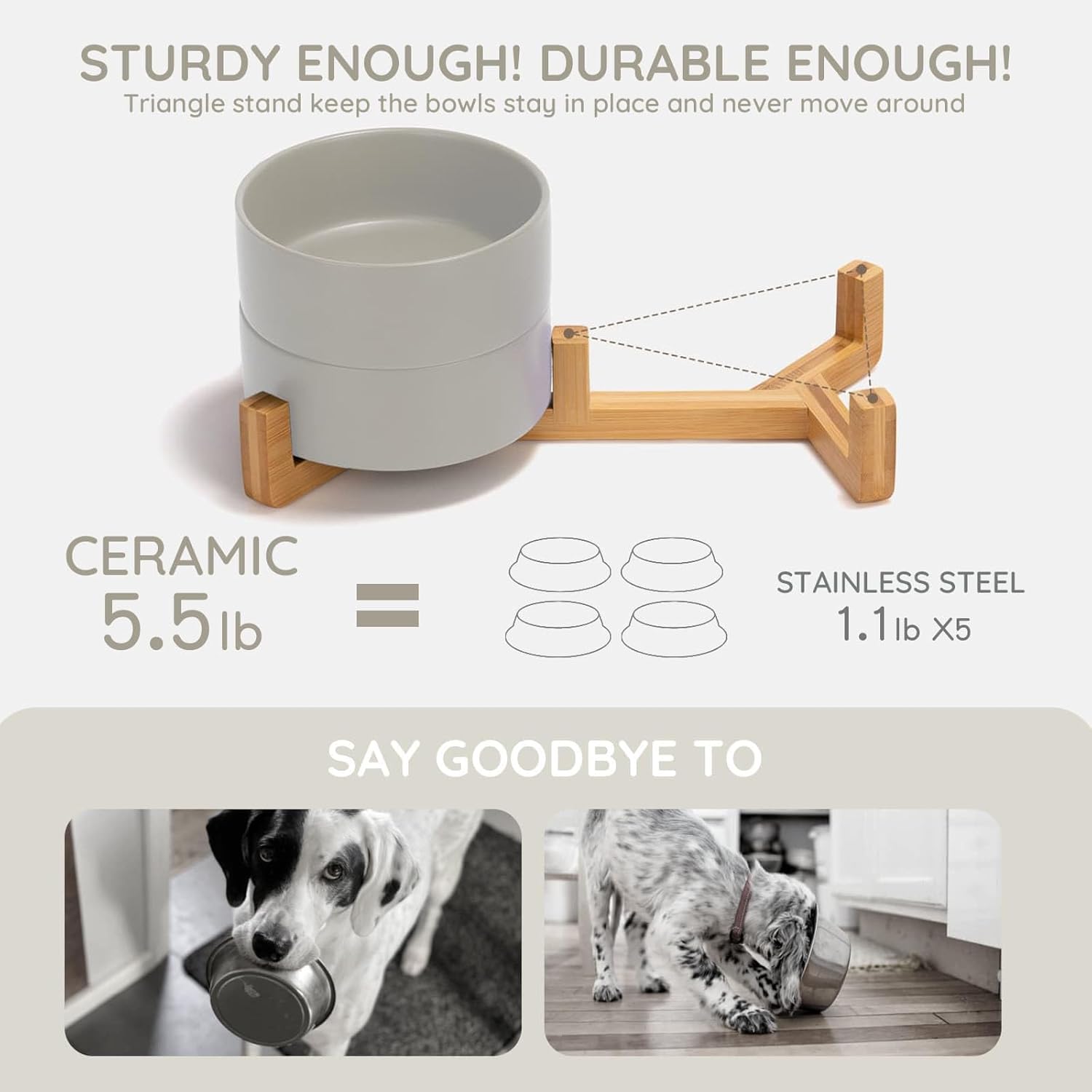 - [Double Bowl Design]:One dog bowl for food and one for water, Each ceramic pet bowl has a Unique wooden stand, raising the dishes closer to your pet for more comfortable eating