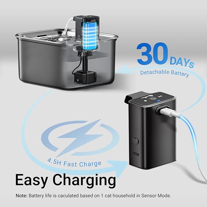 - Long-lasting Battery Life: DownyPaws battery operated cat water fountain features a built-in 4,000mAh rechargeable battery and a detachable design for easy charging. There is no need to worry about your cat's hydration during emergency power outages or short trips