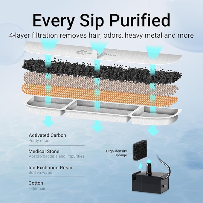 - Enjoy Every Sip of Fresh Water: DownyPaws cat fountains for drinking employs a multi-stage filtration system that effectively removes hair and impurities while releasing trace elements and softening the water to enhance palatability