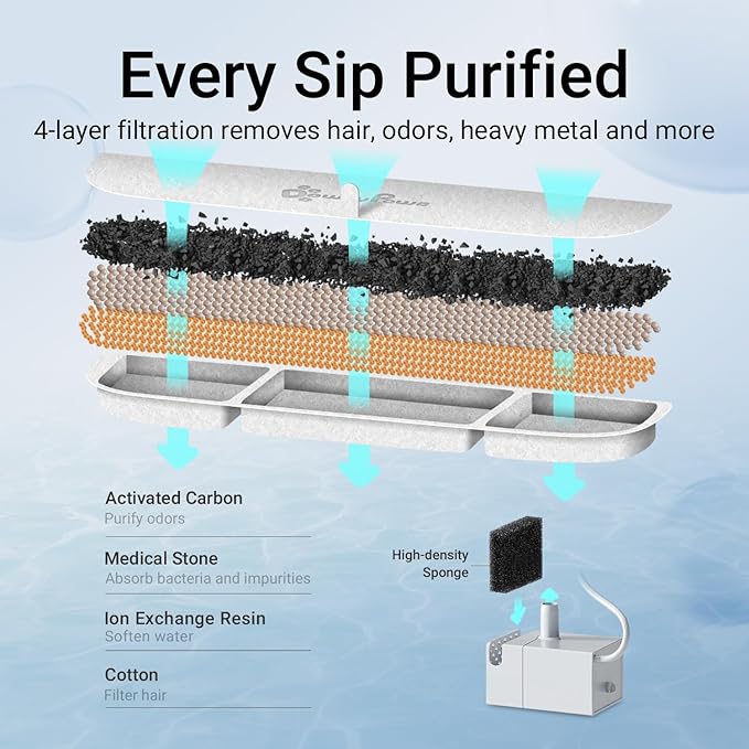 - Enjoy Every Sip of Fresh Water: DownyPaws cat fountains for drinking employs a multi-stage filtration system that effectively removes hair and impurities while releasing trace elements and softening the water to enhance palatability
