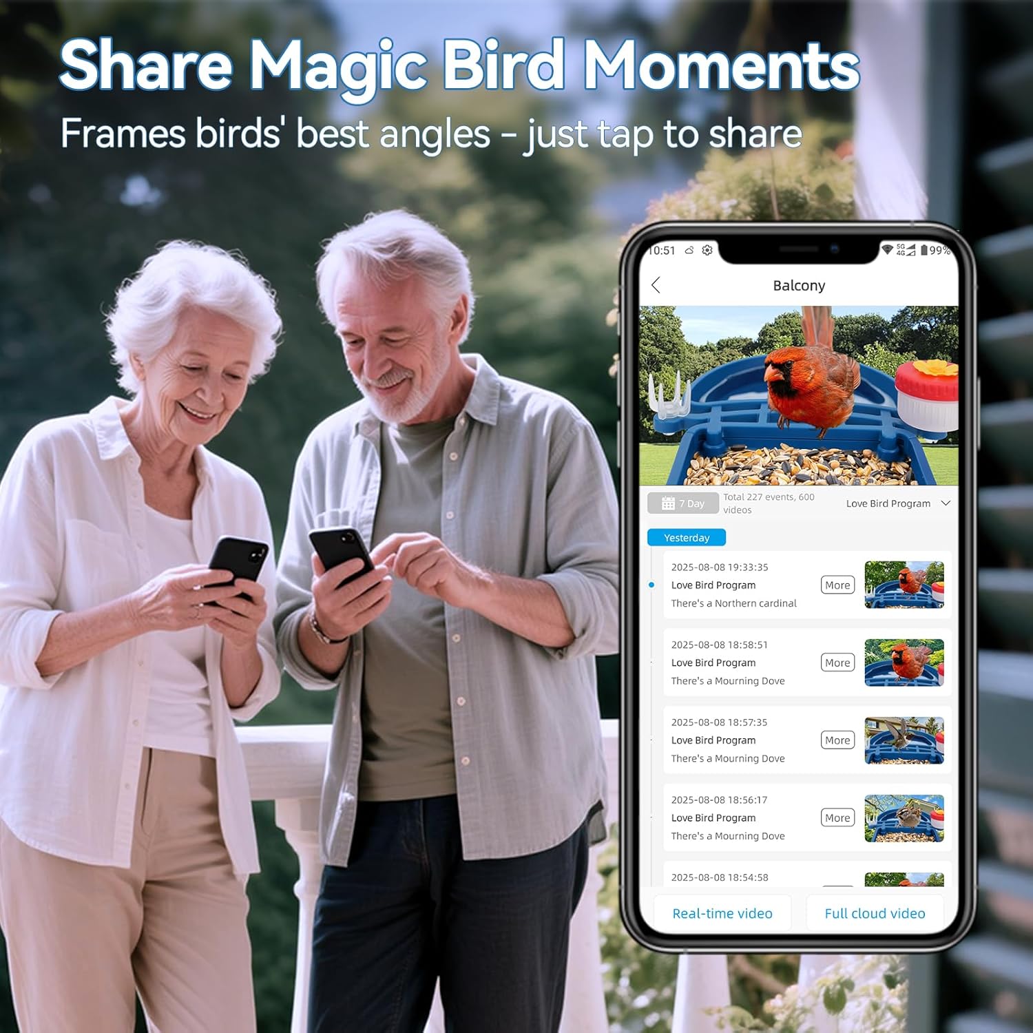 - Bird Watching Brings Us Together - This smart bird camera saves videos in the cloud (cloud storage needs subscription) or on a memory card (you can use any standard SD card). The bird feeder app lets you share fun bird videos and identify bird types. Show your favorite clips on social media or send them straight to family and friends! Perfect for grandparents to share special bird moments anytime, bringing loved ones closer through nature's beauty