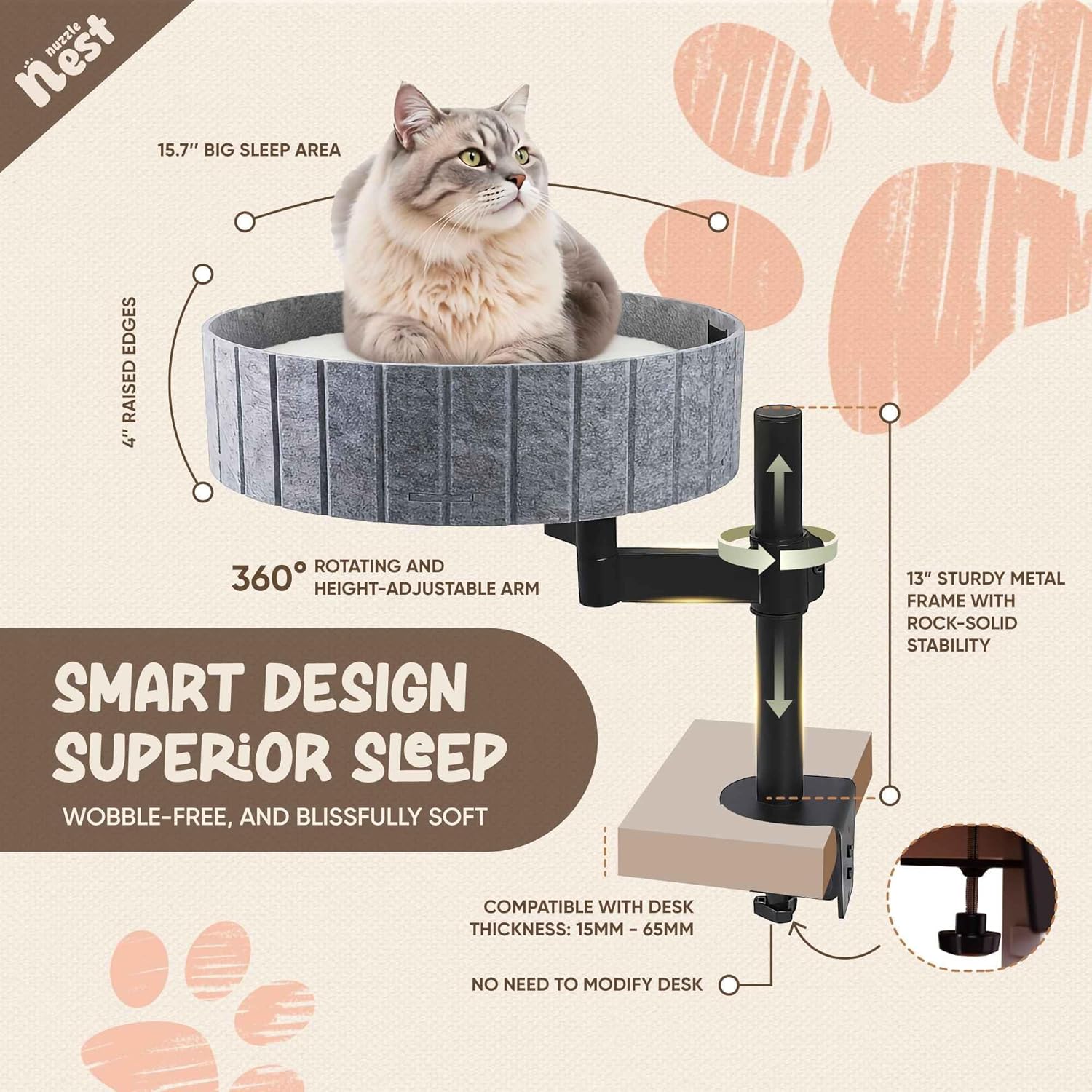 - DAMAGE-FREE 5-MINUTE INSTALLATION: No drilling, no desk damage required. Our protective rubber-padded clamp system installs this computer desk cat bed in minutes on desks 0.6"-2.6" thick. The washable cushion cover ensures easy maintenance - simply remove and wash when needed
