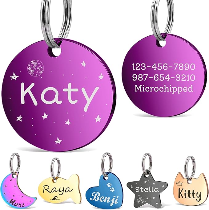 - Cute Font Design Pet ID Tags for Small Size Dog Cat - Personalized laser engraved pet tags with your pet's name, icons and pattern design. A well-designed cute fashion name tag for your beloved dogs, cats, or other pets.