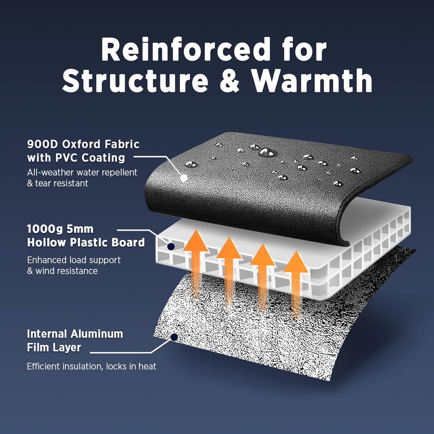 - Extreme Weather Defense.5-layer waterproof insulation blocks wind, rain & snow, maintaining 95-113°F warmth even at -18°C.Aluminum foil-lined chambers create a thermal barrier against arctic winds.
