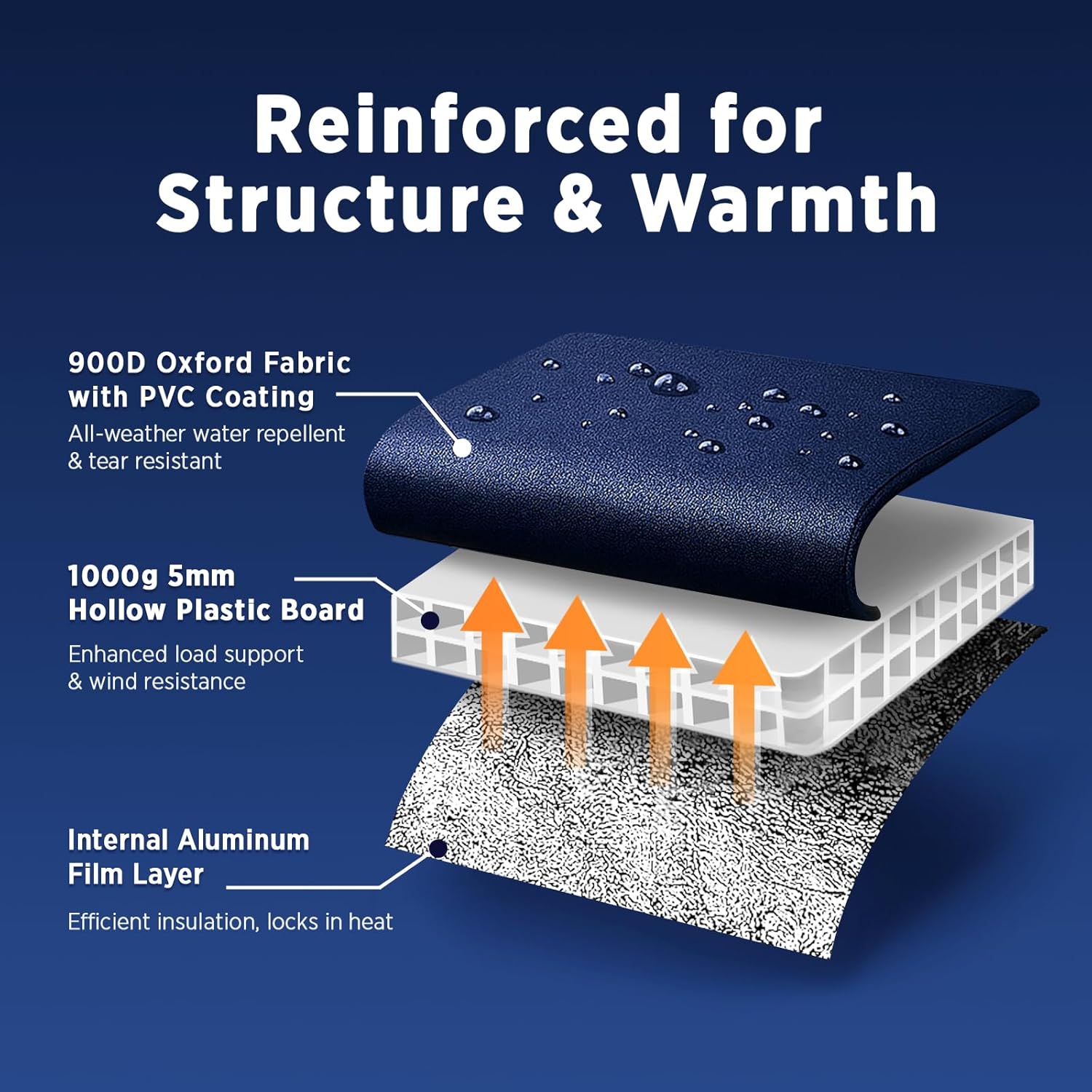 - Extreme Weather Defense.5-layer waterproof insulation blocks wind, rain & snow, maintaining 95-113°F warmth even at -18°C.Aluminum foil-lined chambers create a thermal barrier against arctic winds.