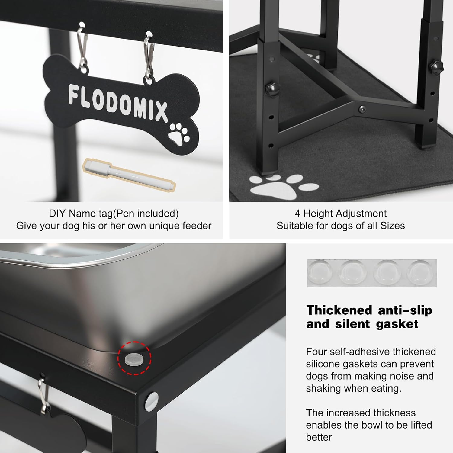 - Sturdy & Tilting-Prevention Stand Included Non-Slip Base & Splash-Proof Mat: The full metal dog water bowl stand has anti-slip feet and can be adjusted to adapt to uneven ground, preventing the raised dog food bowl rack from shaking or overturned. The included mat can prevent spilled water and food, no more messy floors—just a secure, dog bowls elevated setup for your pet