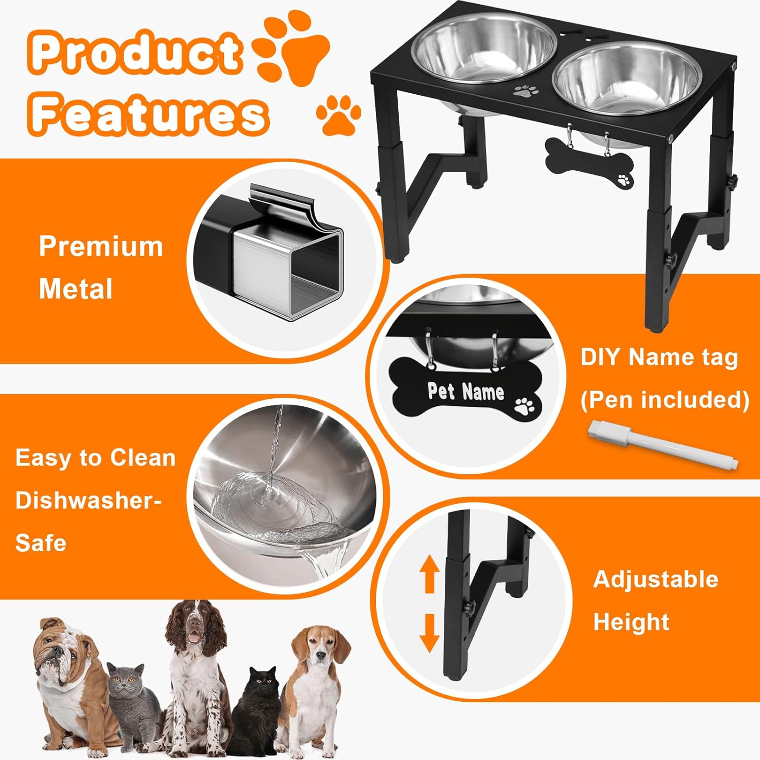 - [ Easy to Assemble & DIY ] The elevated dog bowl comes with required hardware and clear instruction for quick installation. The package is equipped with white markers, You can freely DIY the name or pattern of your pet on the bone name tag