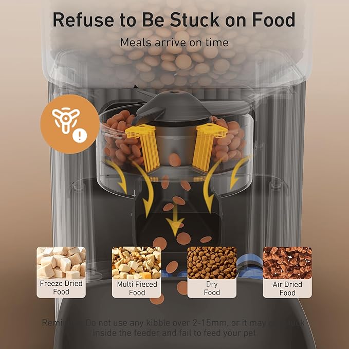 - ๐๐๐ฆ-๐ ๐ซ๐๐ ๐๐๐ฌ๐ข๐ ๐ง: Tired of clogged pet feeders? This automatic cat feeder is equipped with a high-performance rotor and uses smart reverse rotation technology to ensure smooth food flow, preventing any blockages. Whether used frequently or for extended periods, both you and your furry friend can enjoy peace of mind. Note: It supports kibble sizes ranging from 2-15mm