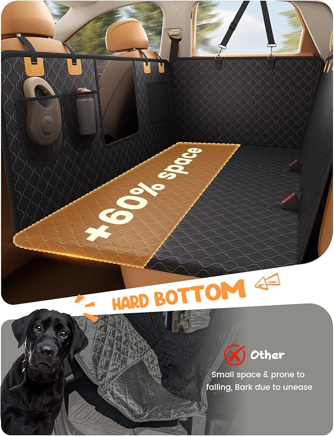 - Anti-Ripped & 430 lbs Max Load: This dog car seat cover hard bottom is built with seamless construction for even weight distribution, so it can resists tearing even on bumpy roads. combined with upgraded 5mm wave-textured PP board supports up to 430 lbs, its enough for two large dogs to stretch or rest comfortably on long trips. Ideal for big breeds, senior dogs, or multi-dog households.