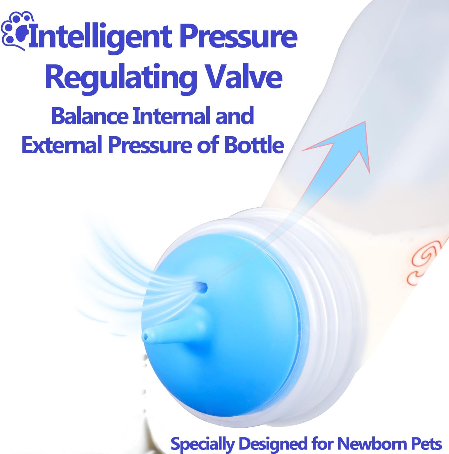 - Regulating Valve: The side of nipple has intelligent pressure regulating valve, balance internal and external pressure, milk and air separation, to avoid the kitten or puppy breathing too much air caused by colic flatulence, and newly designed larger nipples better protect newborn pet's lips.