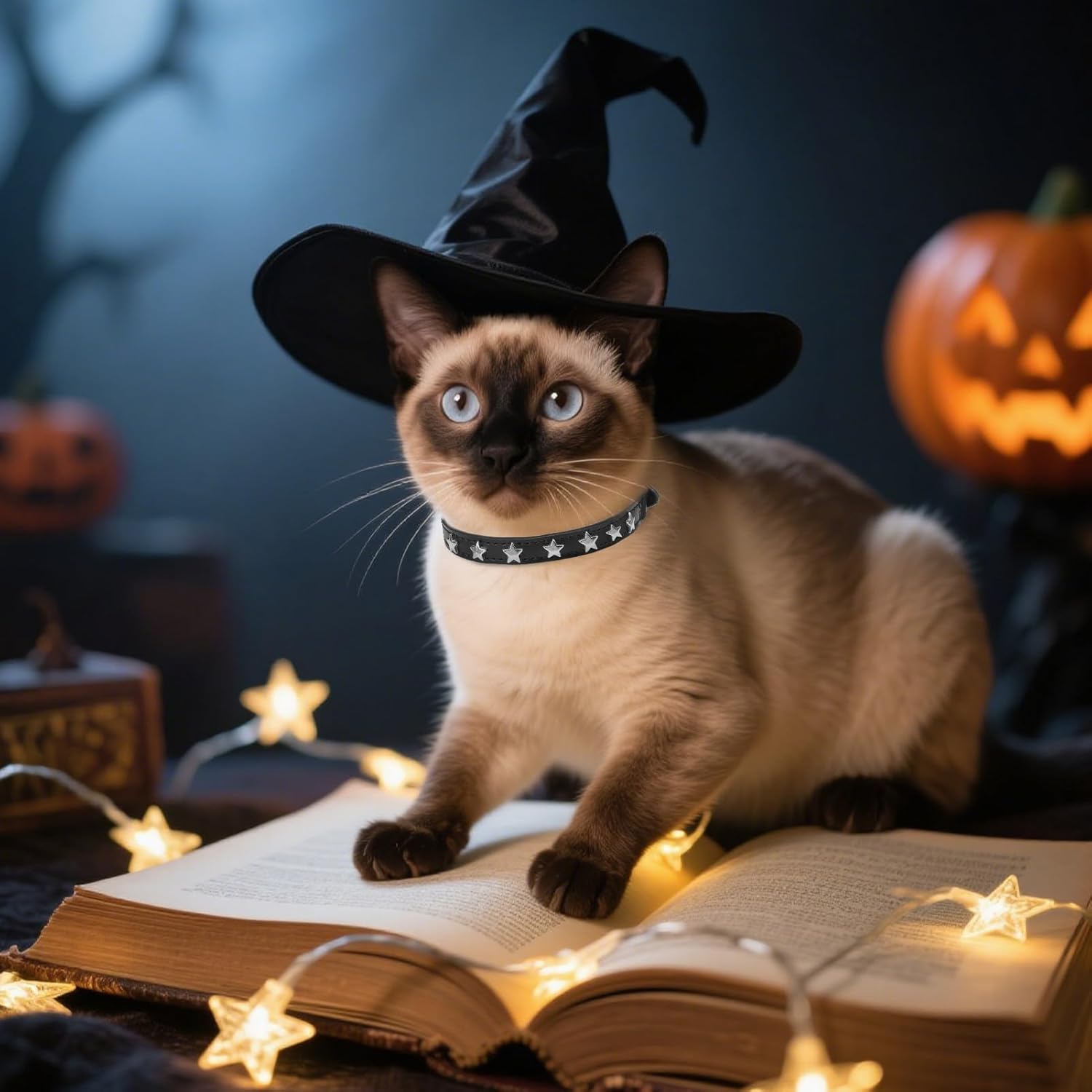 - Halloween Cat Collar:Our Halloween themed collar is designed with a silver pentagram pattern, perfect for adding a festive touch to your pet. It also includes bells and small charms to add charm to your pet.