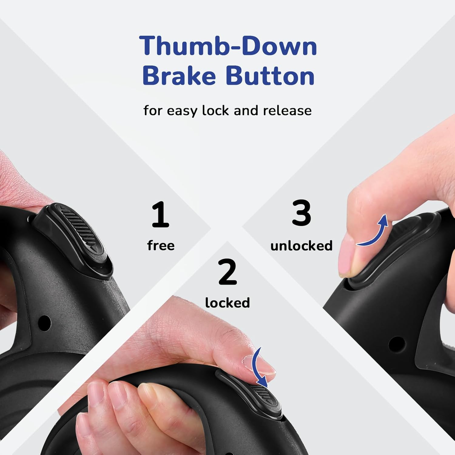 - 【Reliable Braking System】Equipped with sturdy 304 stainless steel spring coils to ensure smooth operation without jamming. The user-friendly one-button brake system allows you to easily control your dog’s range of movement. Whether letting your furry friend explore or quickly locking the leash, it’s all at your fingertips