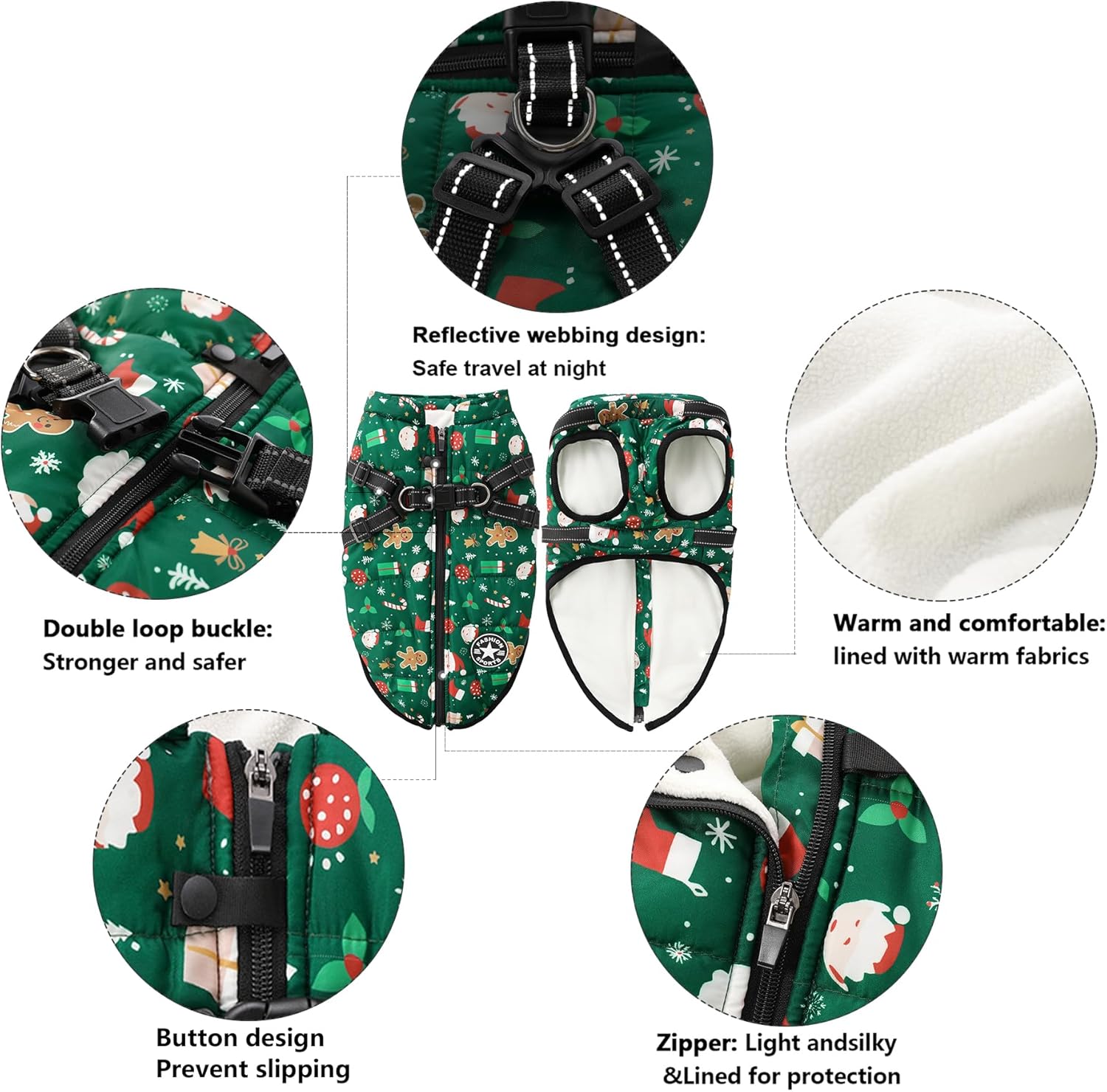 Aiboria Dog Jackets for Winter Windproof Waterproof Vest Fleece Warm Dogs Coat with Belt Christmas Green 3XL