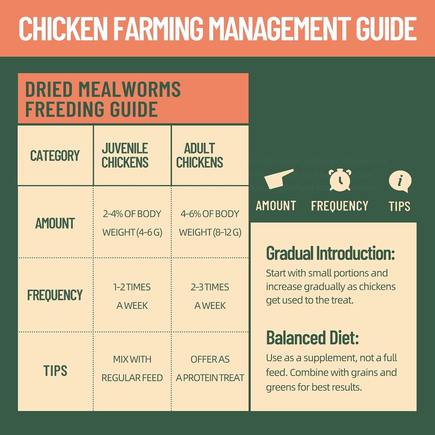 - 【Premium Non-GMO Nutrition】Feed your flock with confidence! Joyprotyn Dried Mealworms are raised on clean, plant-based diets and naturally dehydrated to lock in maximum nutrition. No fillers, preservatives, or additives - just 100% pure, protein-rich mealworms your chickens will go wild for.