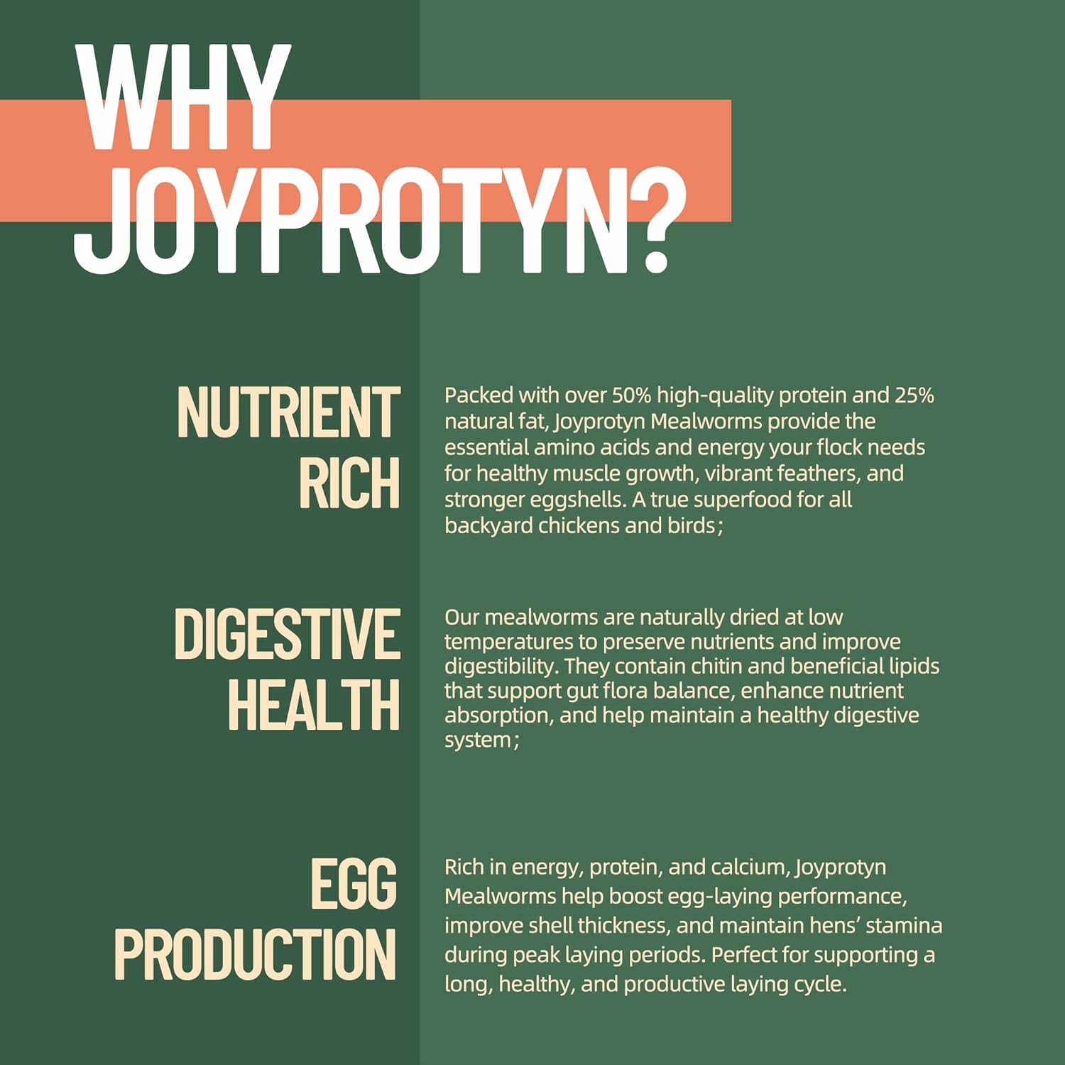 - 【Sustainable Choice for a Better Planet】Joyprotyn supports circular agriculture and food waste reduction by raising mealworms on traceable, plant-based materials. Every bite nourishes your flock and contributes to a more sustainable farming future.