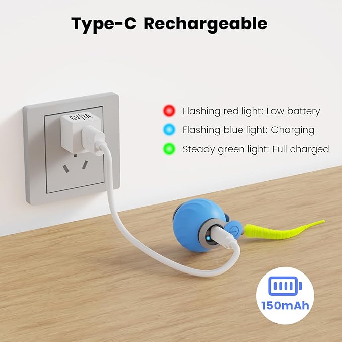 - Dual-mode and dual-speed adjustment: This dual-speed designed cat toy better matches the cat's energy level. Just press the button briefly to activate/switch/turn off the cat toy ball. Long press the button to switch between normal mode (automatically shuts down after 5 minutes) and intelligent mode (automatically standby after 5 minutes). It shows green at low speed and dark blue at high speed. It is suitable for both curious cats and lively adult cats