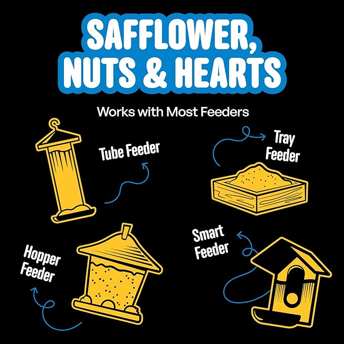 Safflower, Nuts & Hearts Wild Bird Seed – 10 lb. Gourmet Bird Food with Safflower, Sunflower Hearts & Peanuts – No Corn, Milo or Millet, No Waste Bird Food for Outside Feeders