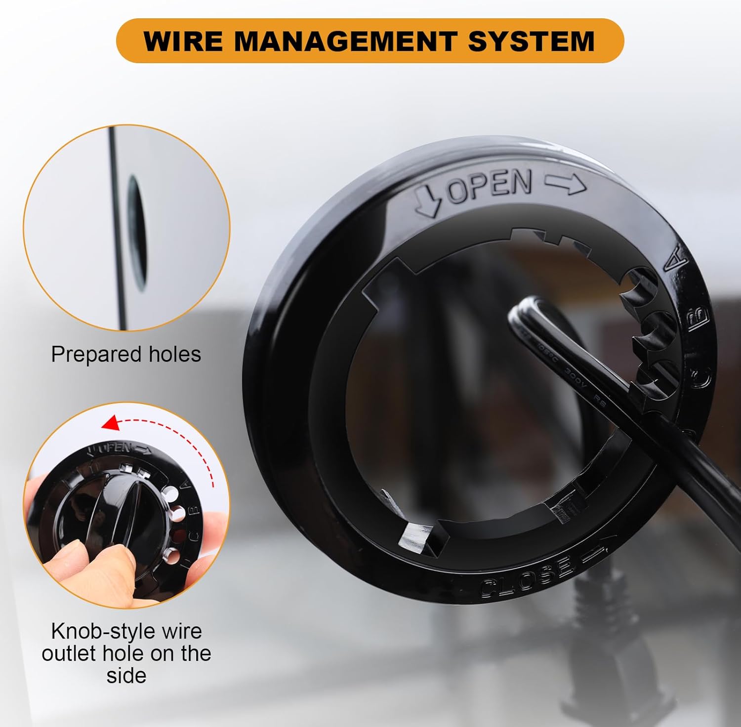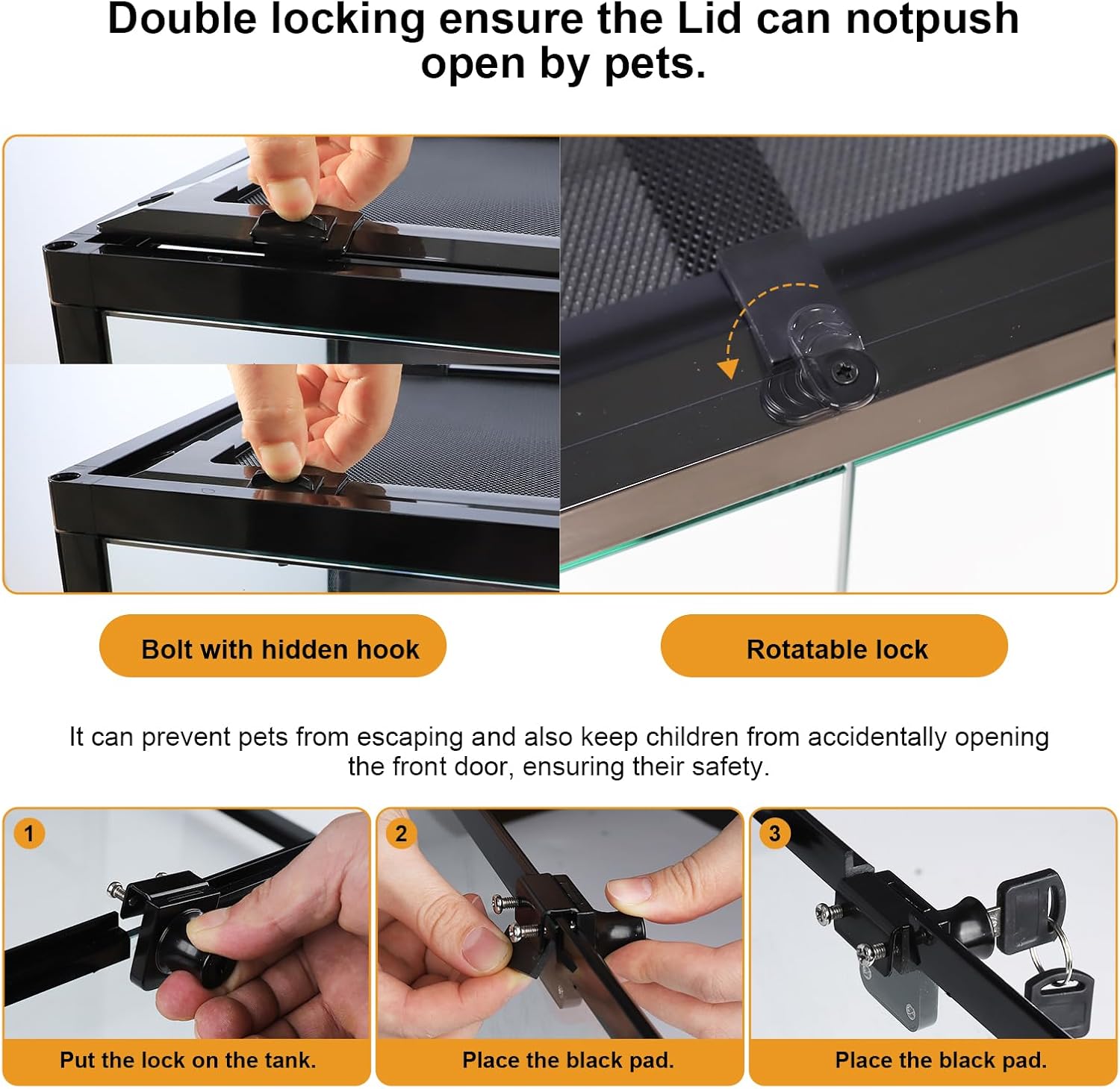 - ANTI-ESCAPE & Cable Pass: In order to convenient for temperature and humidity probes or extra cables insert into the inside of reptile tank, we have design 6 cable holes on the top.Security buckle on the lid ensure the tank closed tightly, prevent your amphibian chameleon pets from escaping. he cable pass system is closable wire or tube inlets to prevents small insects or reptiles from escaping.And the security lock avoid the doors open accidently by your kids and keep your kids safe.