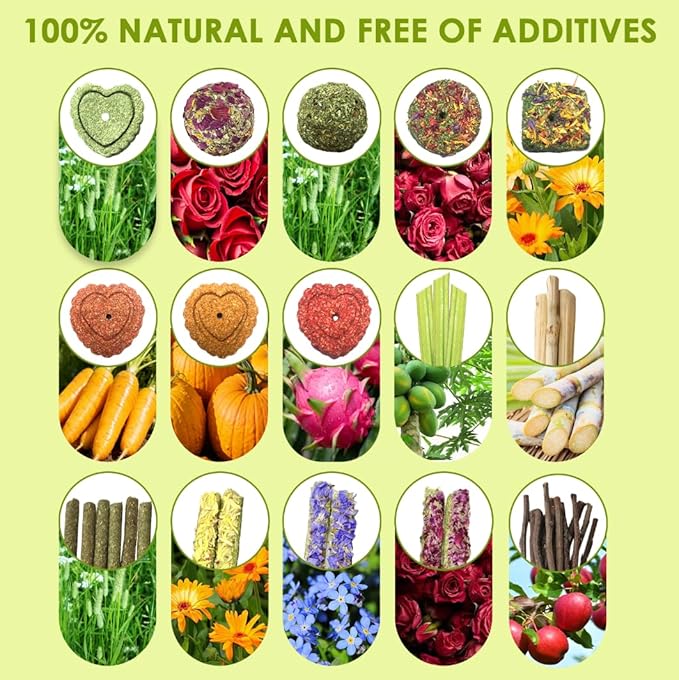 - 【List of Packages for Rabbit Enrichment Toys】 Apple branch*6 (100g approx.), Sweet bamboo *5 (100g approx.), Apple wood slices*5 (diameter 3.5-4.5cm), Apple wood small pieces*5 (diameter 1.5-2cm), Rose grass ball *2, Marigold Grass Balls*2, Flowerless grass ball *2, Carrot Grass Balls *2, Marigold Grass Cake *3, Forget-me-not Cake*3, Flowerless grass cake *3, Carrot Grass Cake *3, Grass Stick Flowerless*4, Rose straw *2, Chrysanthemum Straw Cake *2, Forget-me-not straw *2, Hook *4, Papaya stems (10 stems), Transparent box *1, Sisal rope 100cm*2