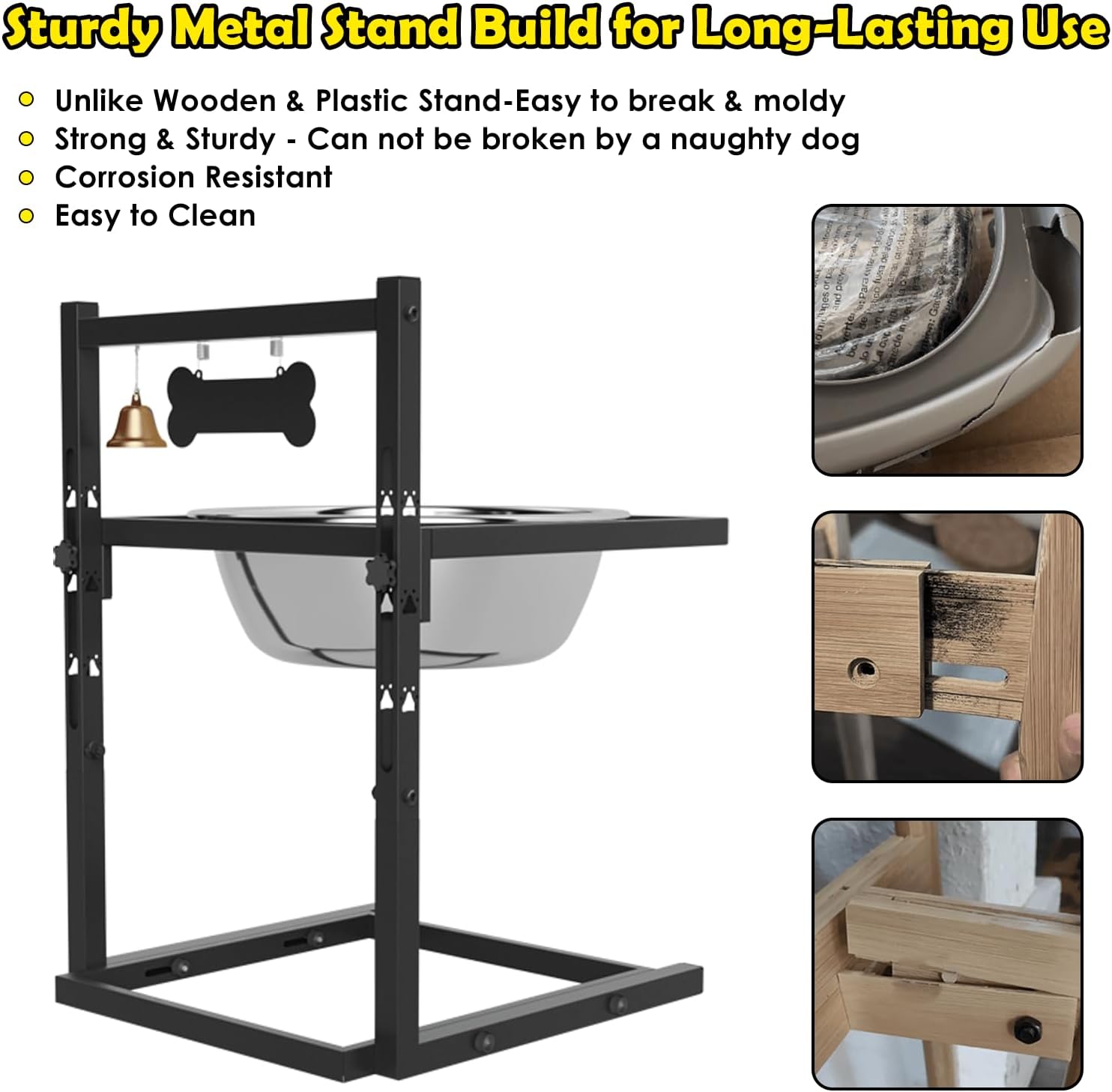 - STURDY AND DURABLE: Crafted from high-quality rust-resistant metal and powder-coated steel, this dog bowl stand is more robust and long-lasting than plastic alternatives. The base of the dog food stand is expandable (by loosening and tightening bolts) to securely hold the food bowl in place