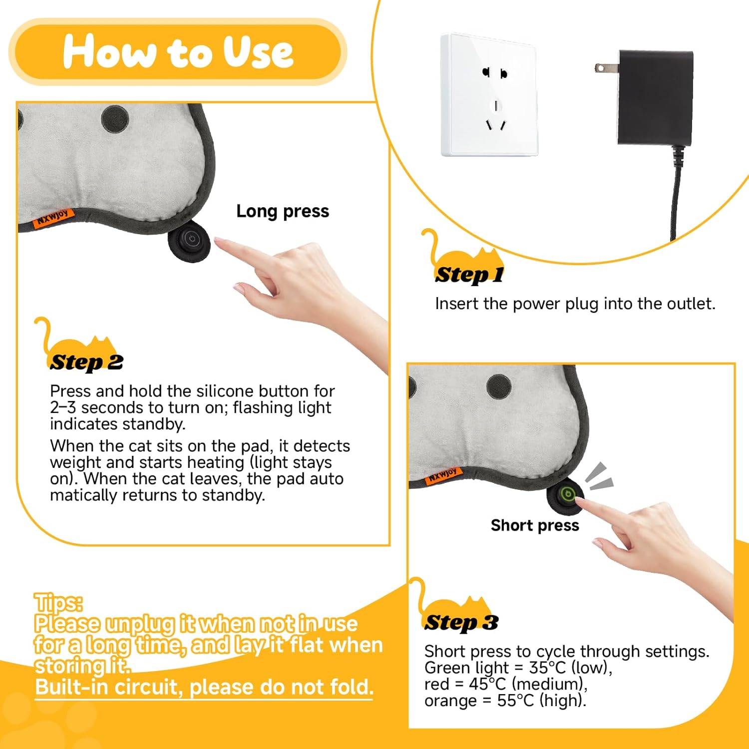 - Safety & Convenience with 3 Levels Temperature: Uses 12V low voltage with nylon-braided, bite-resistant wire to prevent electric shock and ensure pet safety. Simple 3-level temperature control: press and hold the silicone button about 2~3s to turn on/off, short press to cycle through settings. Green light = 35°C (low), red = 45°C (medium), orange = 55°C (high). Heats automatically by gravity induction — flashing light indicates standby, steady light means heating.