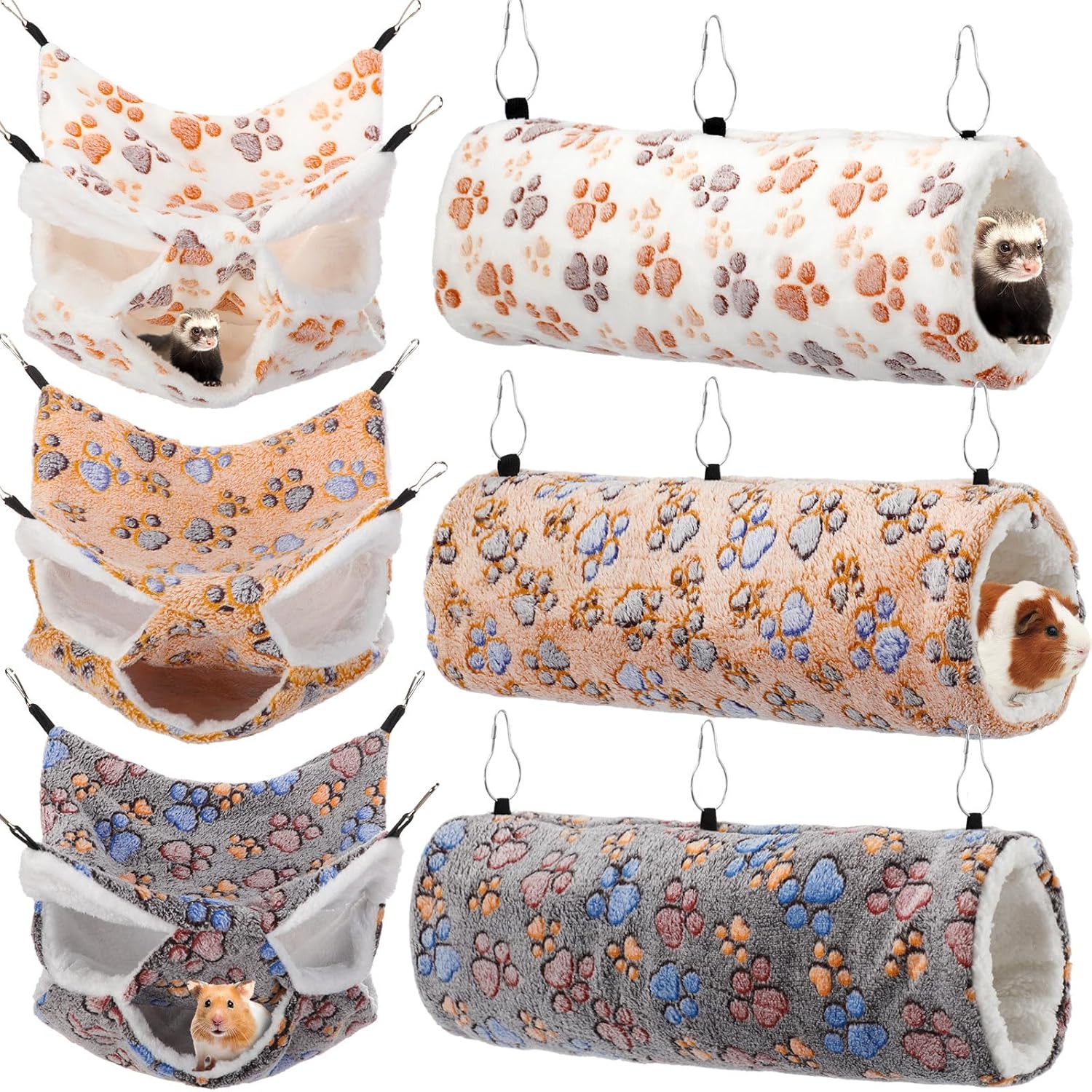 Sweetude 6 Pcs Rat Hammock Set Ferret Hanging Tunnel 3 Tier Guinea Pig Hammocks Hideout Soft Chinchilla Bed for Cage Accessories Hide,Play and Sleep(Cute,Paw)