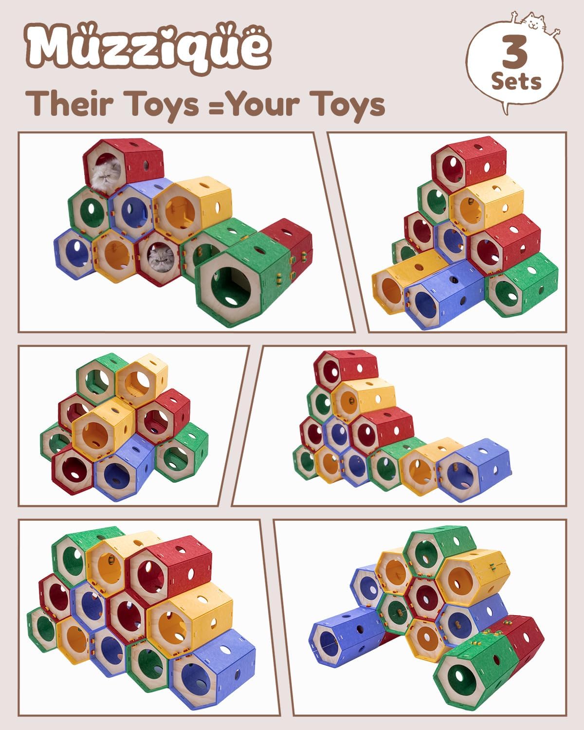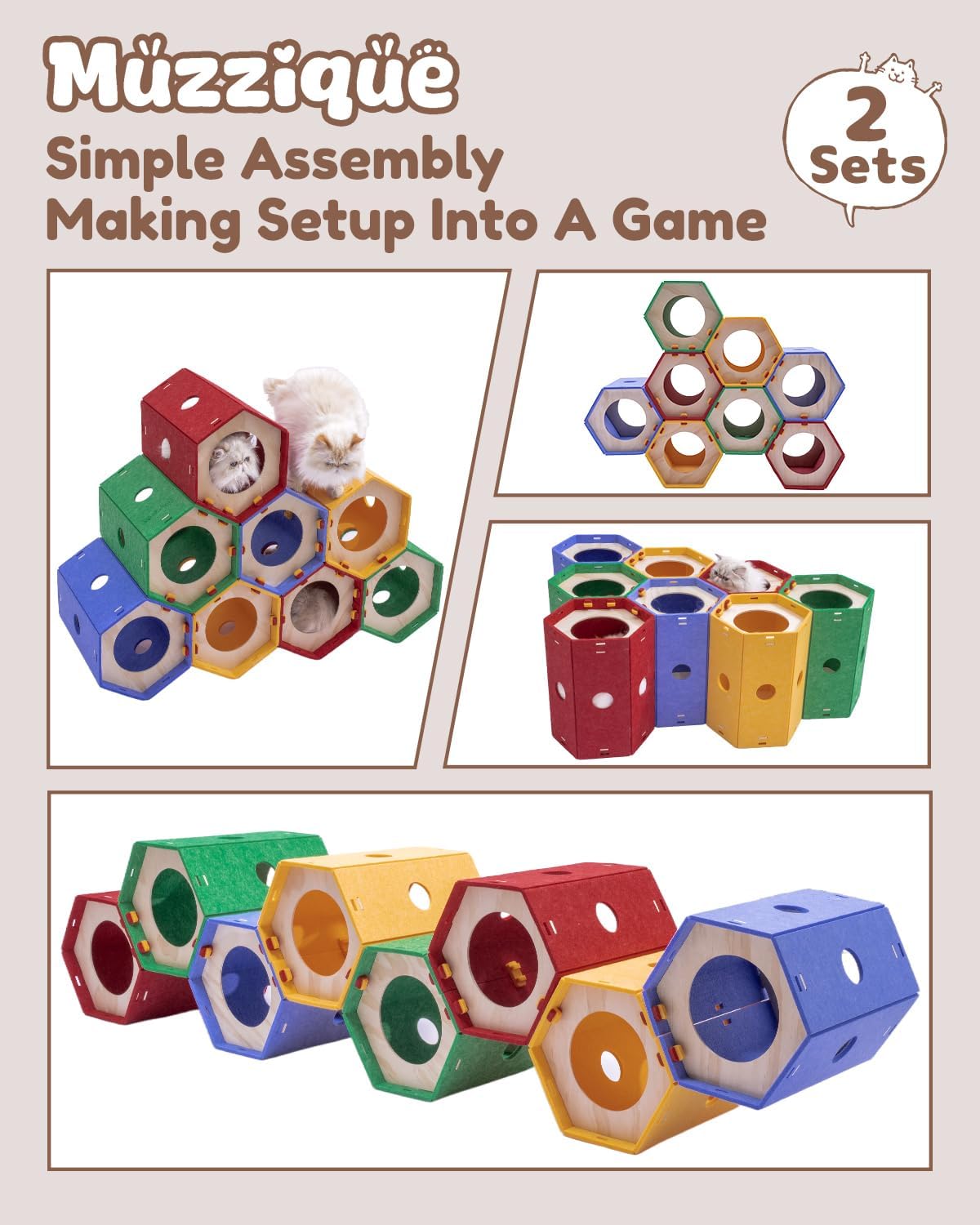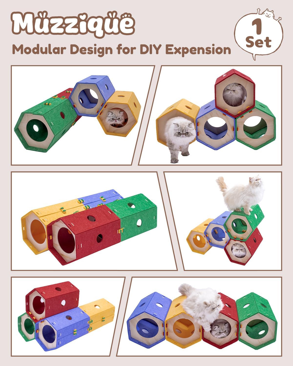 - [Human & Cat Co-Creation Toy] Design your own feline funhouse with this human and become a pet artist! Connect these hexa-tunnels like colorful building blocks to form pyramids, mazes, multi story cat house/bed, long tunnel, colorful condo, cat tree/step/perch, or cozy caves. Provide engaging fun for your pets and unleash your creativity—every rebuild sparks new adventures for both of you.