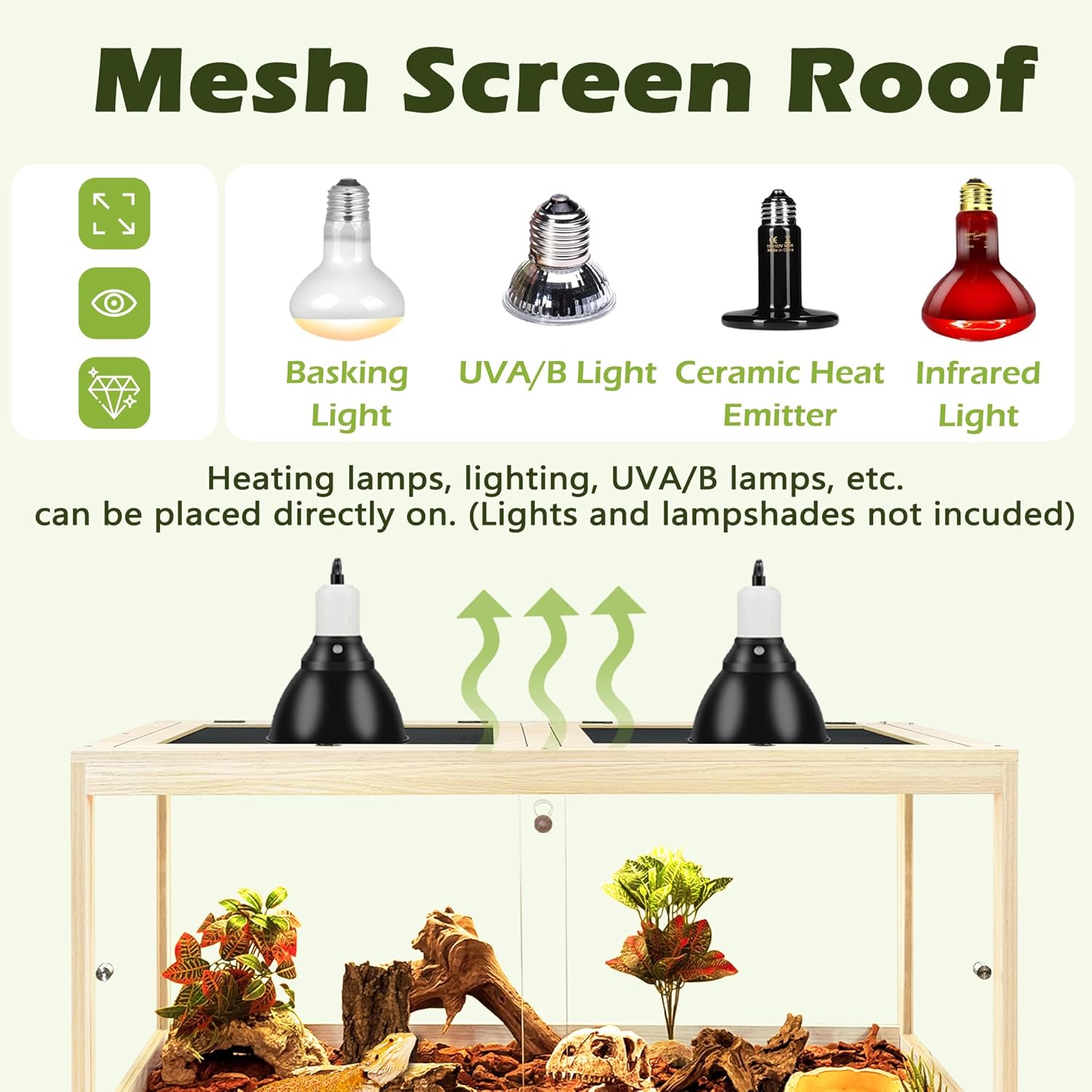 - 【Functional Design】Our terrarium is thoughtfully designed with a user-friendly layout. The double sliding front doors glide effortlessly and feature a secure locking mechanism to ensure your pets remain safe and secure. The top is equipped with durable metal mesh for optimal airflow, ideal for positioning heat lamps and UVA/B lights (not included) to maintain precise environmental conditions.