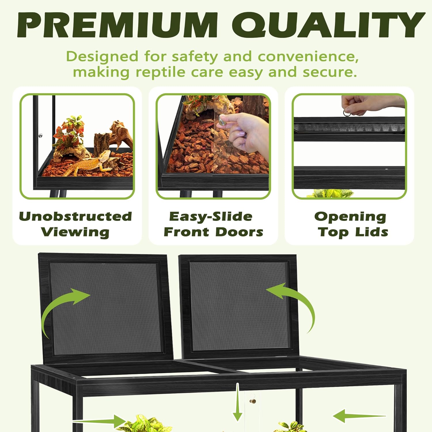 - 【Functional Design】Our terrarium is thoughtfully designed with a user-friendly layout. The double sliding front doors glide effortlessly and feature a secure locking mechanism to ensure your pets remain safe and secure. The top is equipped with durable metal mesh for optimal airflow, ideal for positioning heat lamps and UVA/B lights (not included) to maintain precise environmental conditions.