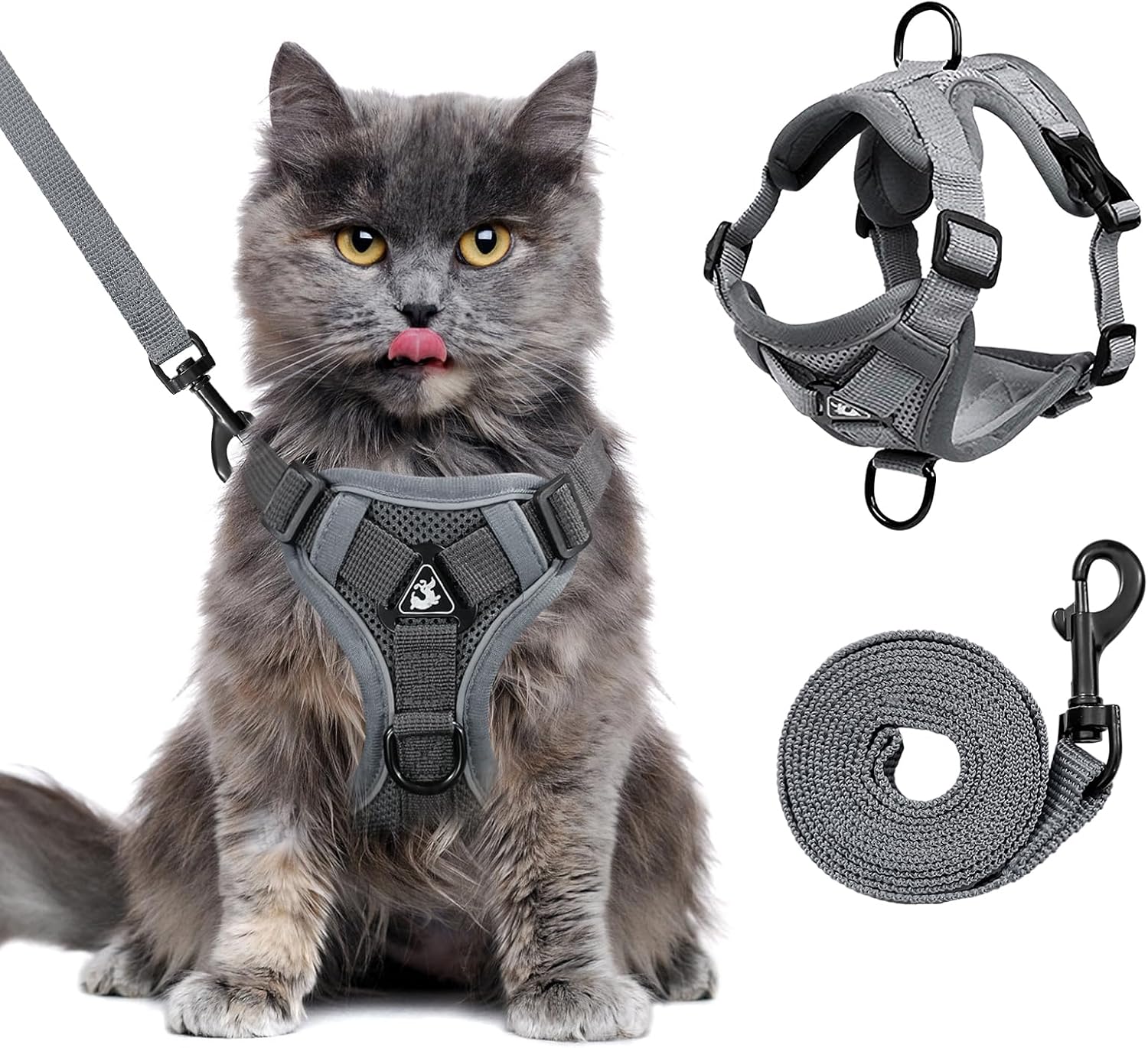 Escape Proof Cat Harness and Leash Set for All Types of Cats - Adjustable Reflective Soft Mesh Vest with 4 Buckles, Breathable Walking Harness for Kittens to XL Cats