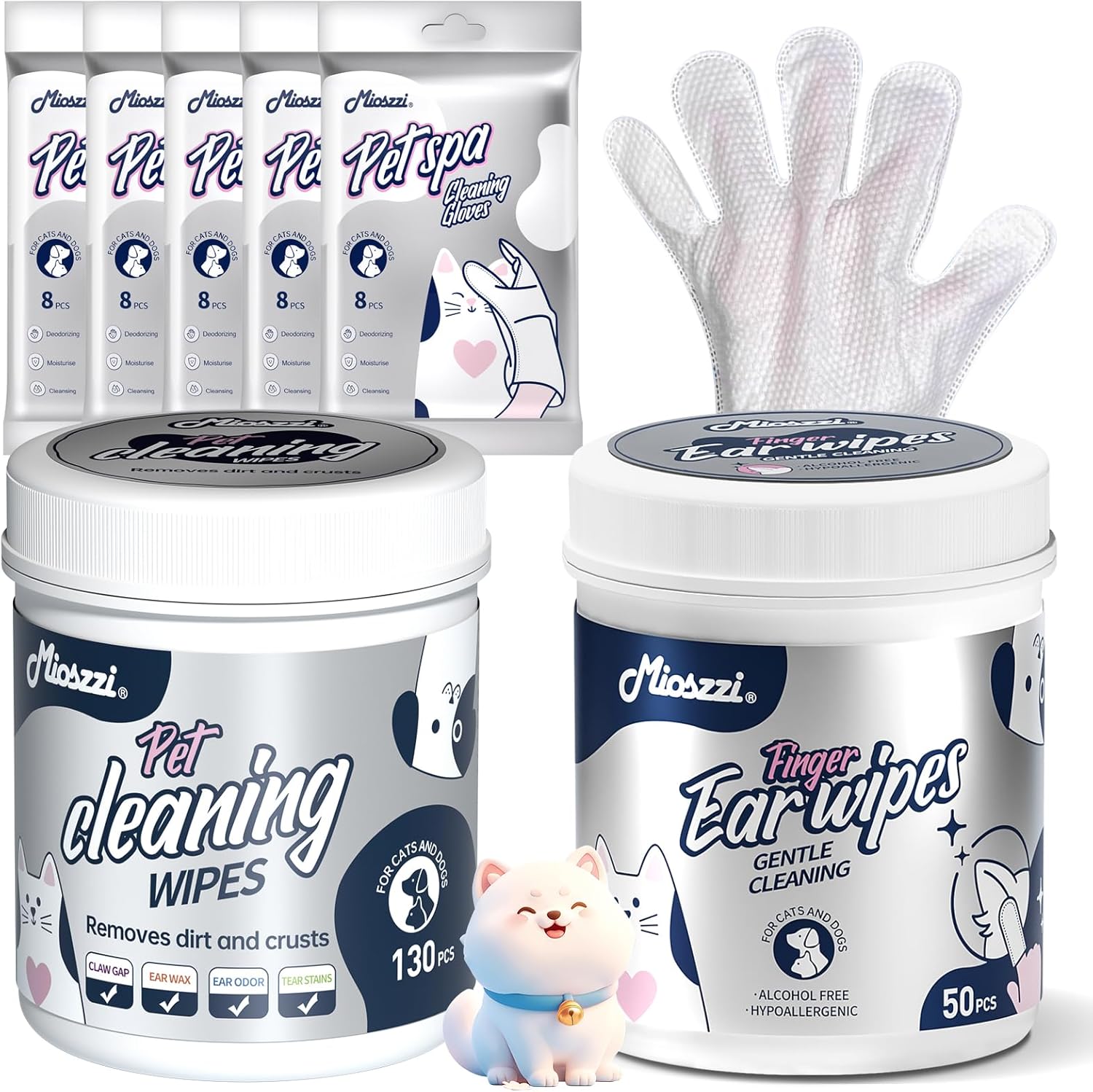- Complete 3-in-1 Grooming System:This bundle includes 40 glove wipes for paws and body, 50 ear cleaning wipes, and 130 eye cleaning wipes - everything needed for full pet care. The textured glove design provides better cleaning control than standard wipes