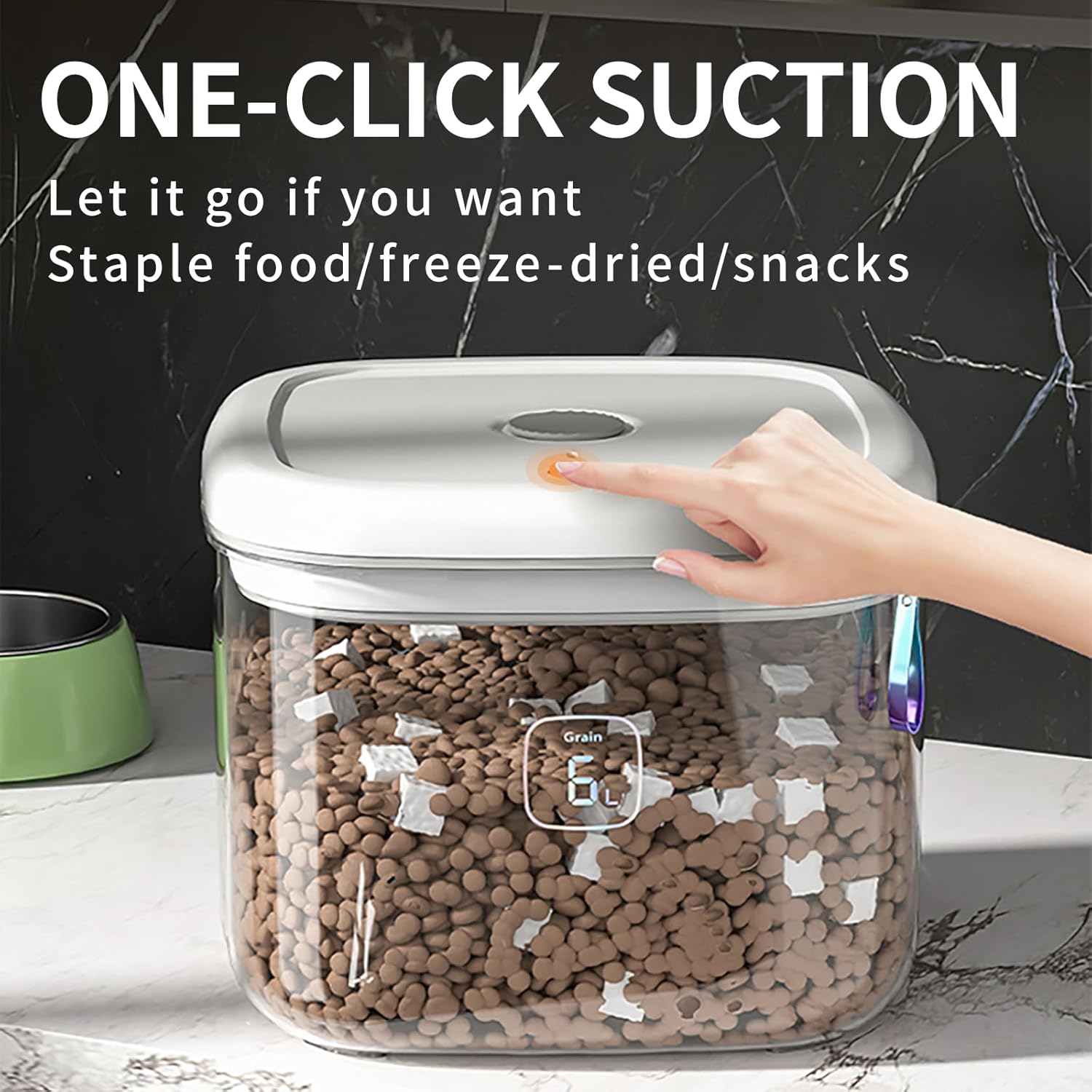 - One-Hand Operation for Pet Parents:Push-button lid opens in 1 second—easy to use even when holding a pet or food scoop. Press the vacuum valve to seal quickly, avoiding spills and keeping pet food secure between feedings.