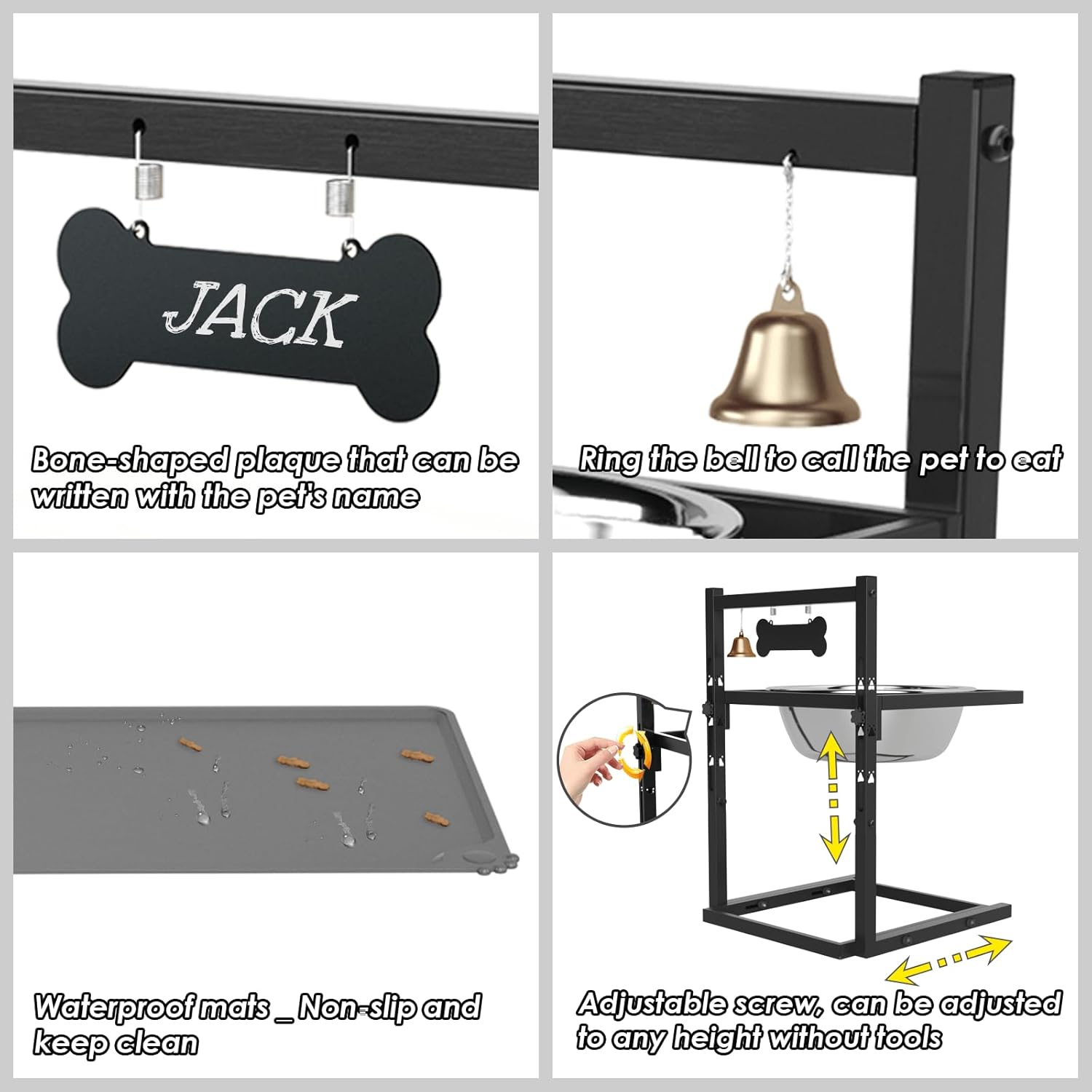 - 【Easy to Assemble】 - Simple design, assembly takes only 5 minutes. It's very easy to adjust: just choose the right height and tighten the bolt. The dog bowl set includes one high water bowl stand, one stainless steel water bowl, one mat (20x32in), one signature pen and other tools you need to put it together.