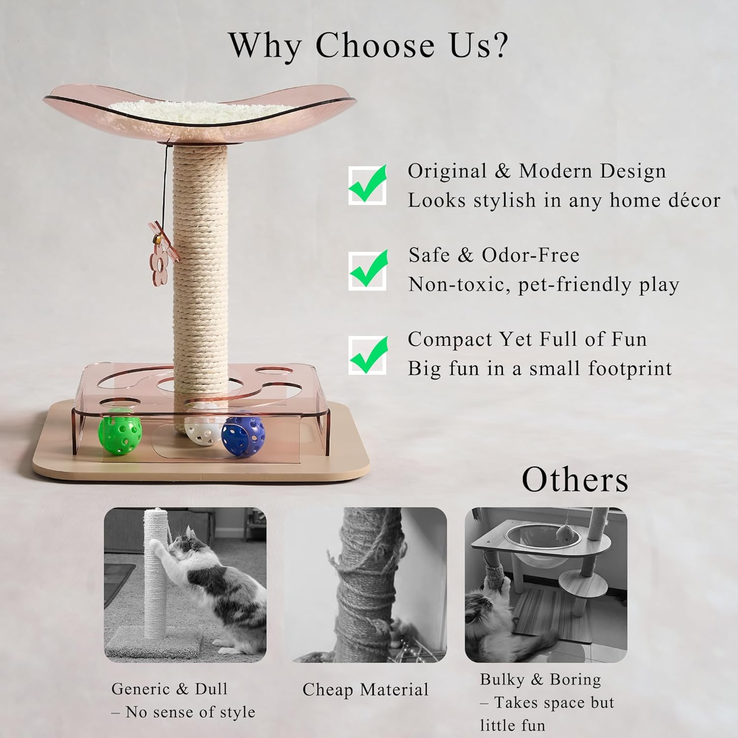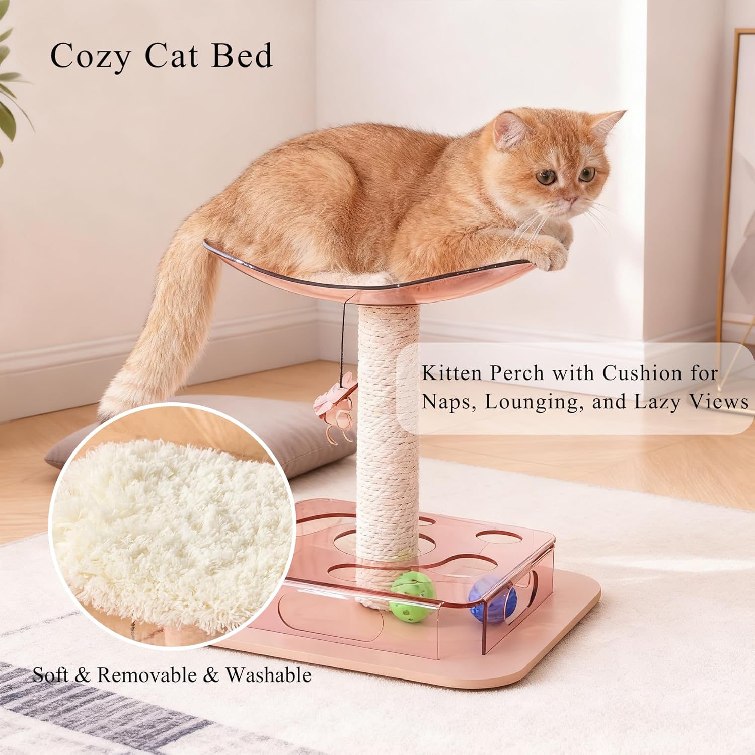 Modern 3-in-1 Interactive Cat Toy with Puzzle Box, Cat Bed/Perch & Scratching Posts, Colorful Jingle Balls, Dangling Accent, Puzzle Toys for Indoor Cats, Acrylic, Pink