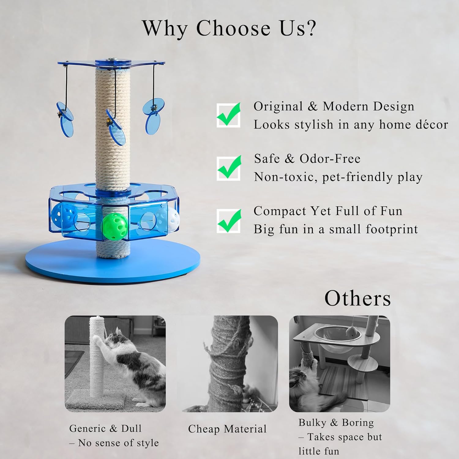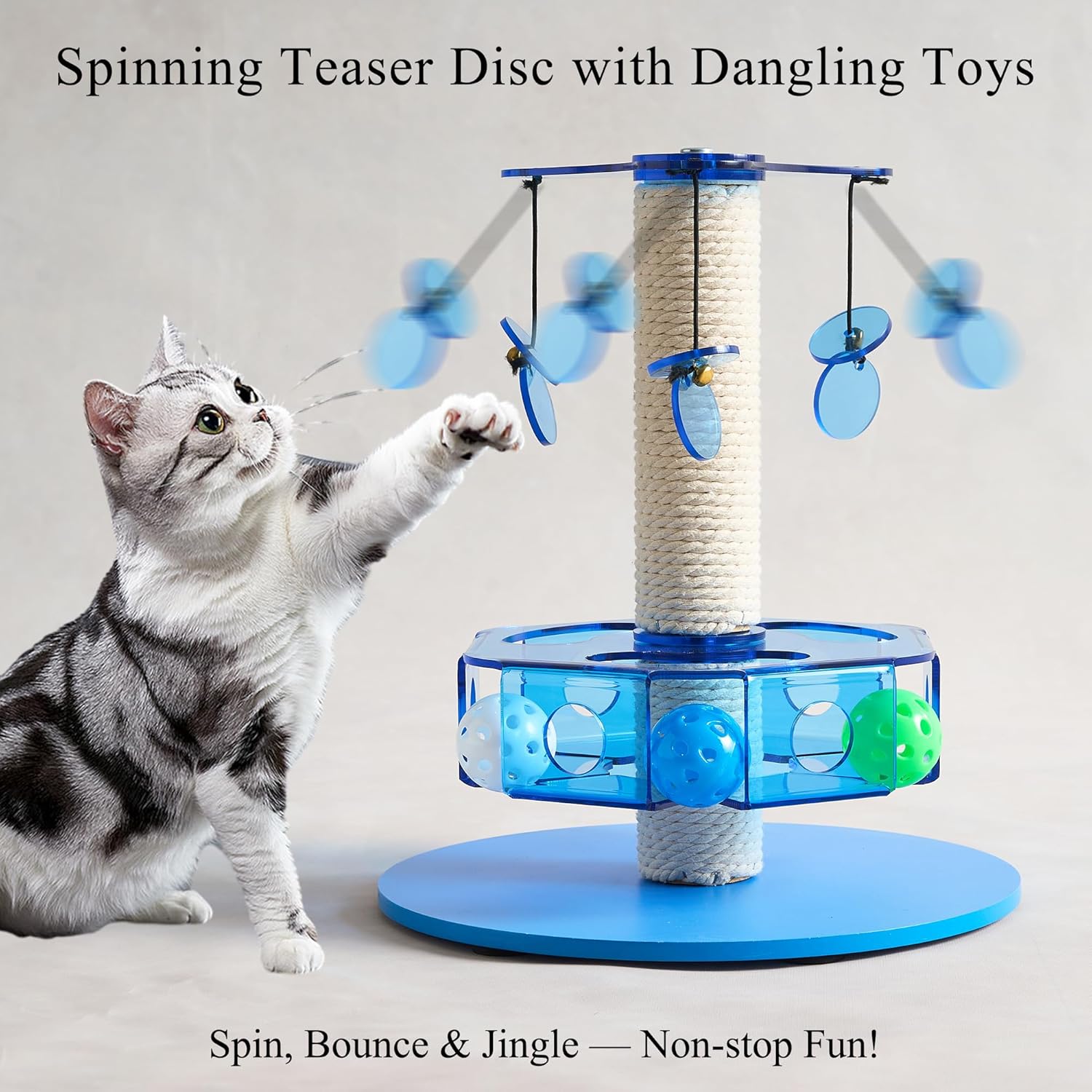 Modern 3-in-1 Interactive Cat Toy with Scratching Post, Rotating Cat Puzzle Toys for Indoor Cats with Colorful Jingle Balls, Spinning Teaser Disc with Dangling Toys, Acrylic, Blue
