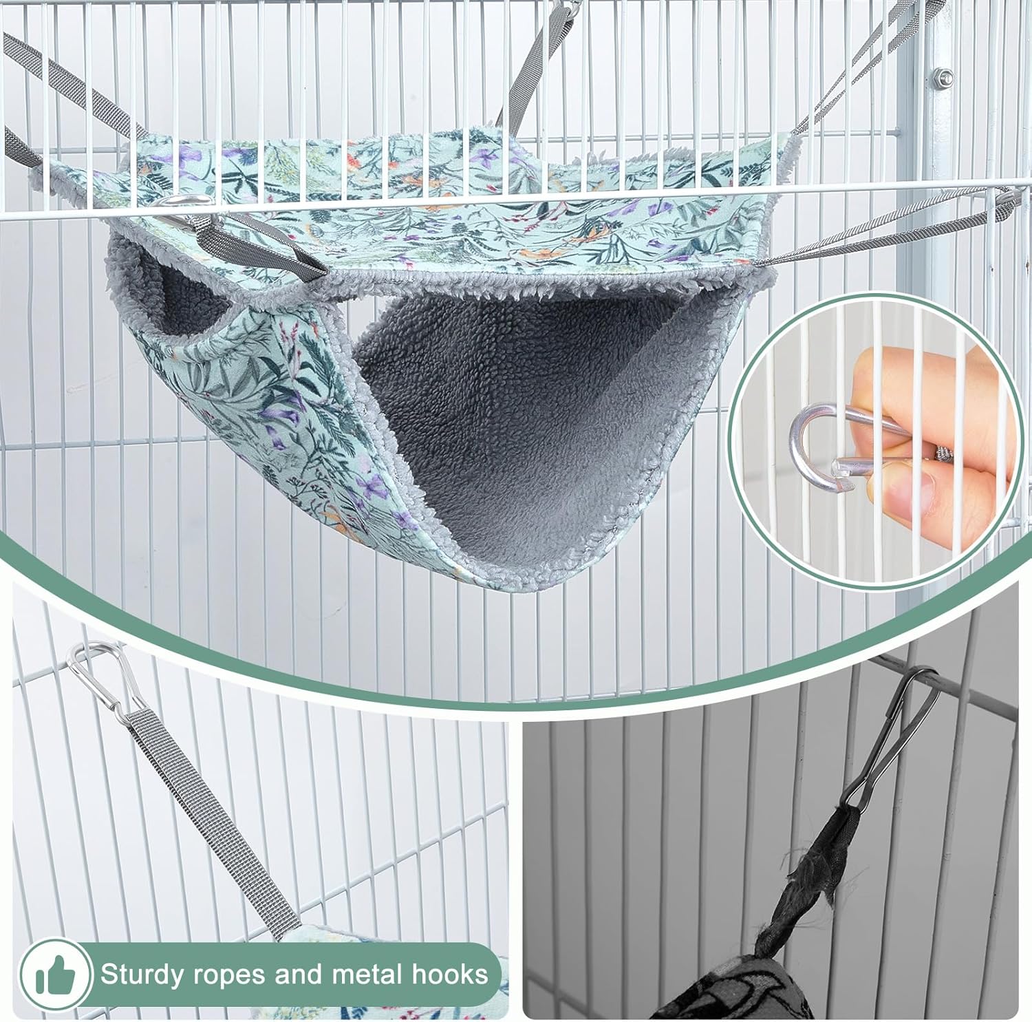 - Sturdy and Adjustable Ropes:The ferret hammock and tunnel sets have a 3.9in long rope that is sturdy, convenient for adjusting the height, and the hanging position can be adjusted according to needs by knotting; The metal hook is stable and stable, and it is not easy to be damaged after long-term use