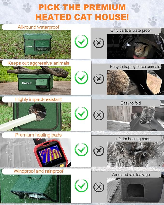 - ๐๐ข๐ง๐ ๐๐ง๐ ๐ซ๐๐ข๐ง ๐ซ๐๐ฌ๐ข๐ฌ๐ญ๐๐ง๐ญ: The elevated off-ground design of this heated cat bed outdoor prevents moisture buildup at the bottom. Its cat heating pad heater outlet, eaves, roof, and escape door are all waterproof and designed to withstand wind and rain. This fully weatherproof heated cat house ensures that your catโs environment stays dry and comfortable.