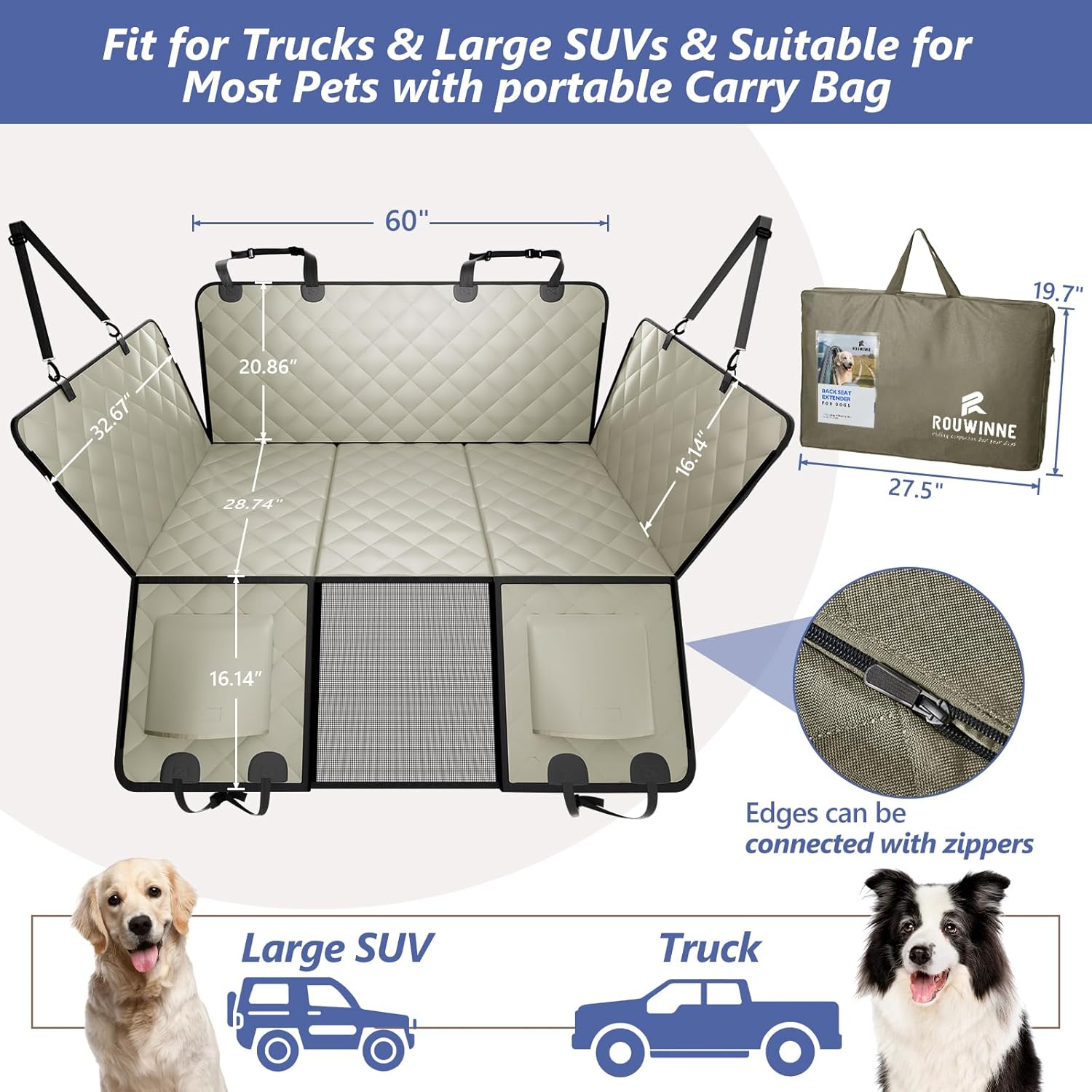 - 【MESH WINDOW, THICKENDE WEBBING & STORAGE POCKETS】 ROUWINNE back seat pet cover for dogs opens a mesh window for more breathable, allows your dogs see you and reduce anxiety. The mesh window is also equipped with non-slip zippers on both sides, through which you can also interact with your dogs. The encrypted and wider webbing latch is more sturdy. This truck rear seat covers for dogs has two large storage pockets to put your dog's toys and snacks in. Take your dogs on a safe and comfort trip!