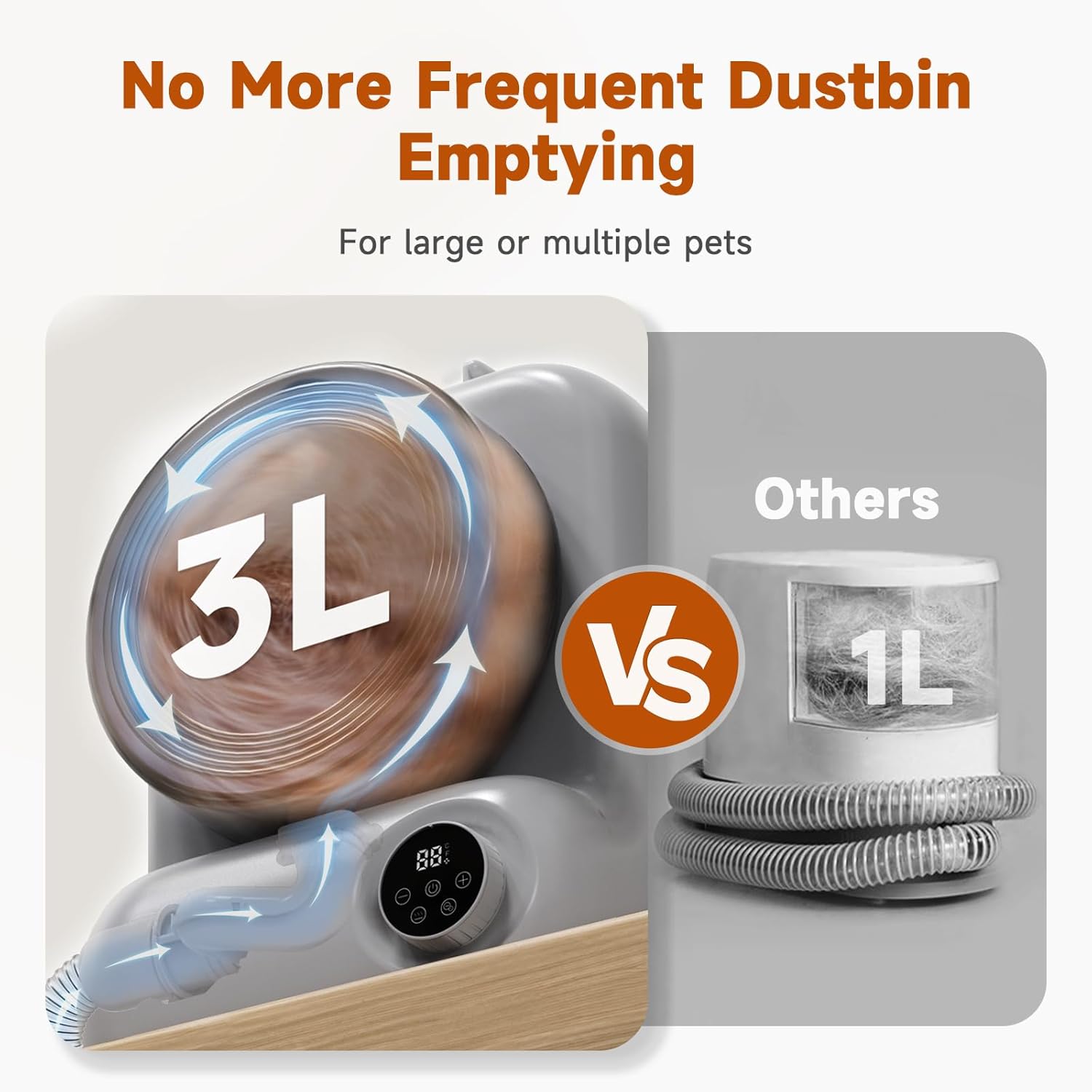 - 3L Large Canister for Efficient Cleaning - The extra-large, detachable 3L collection container of this dog grooming vacuum means no need for frequent emptying during multiple pet grooming, significantly improving efficiency. The cyclonic airflow design prevents clogging, allowing you to carry out long grooming sessions effortlessly with this pet grooming vacuum for dogs.