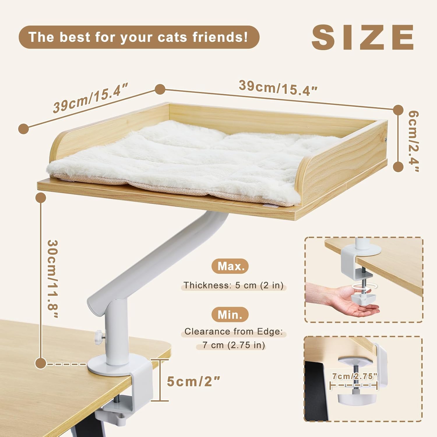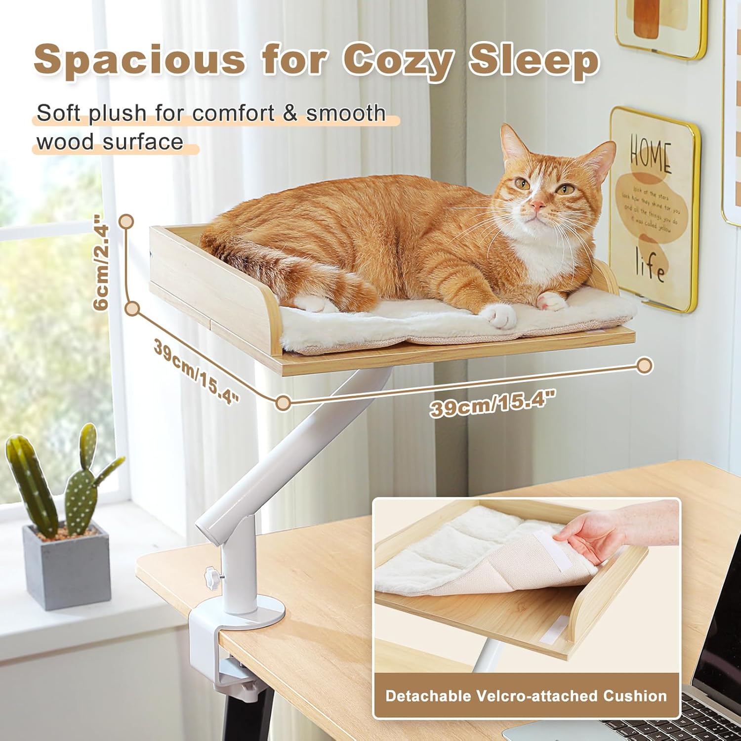 - Elegant & Adjustable Design: This wooden cat bed for desk boasts a square design with sleek surface that pairs any home or office decor. The adjustable clamp-on mounting system securely attaches to any desk or table edge, providing a cozy and elevated lounging spot for your feline companion.